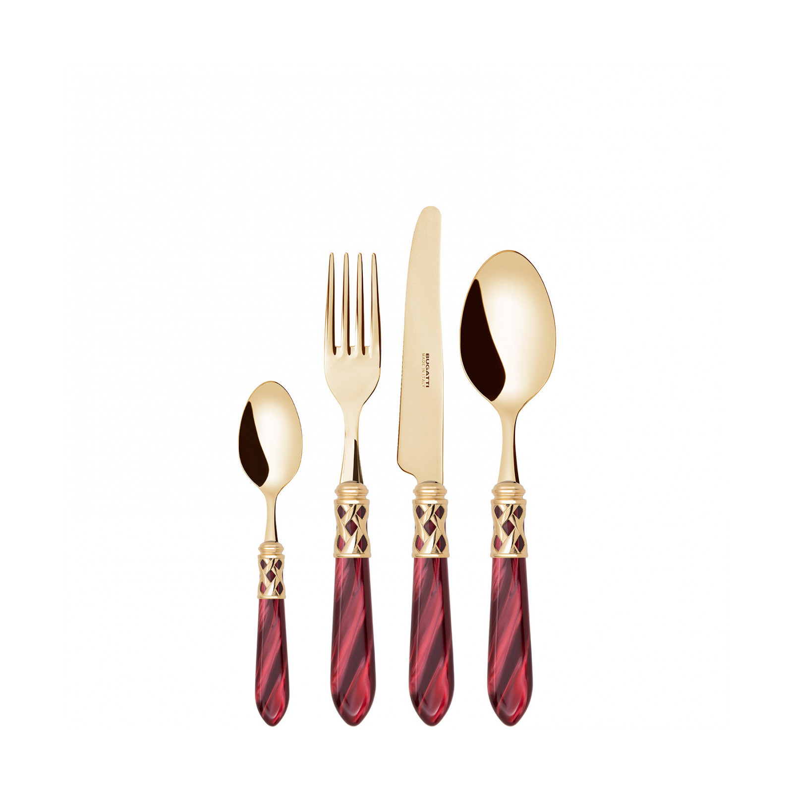 The coloured Aladdin Gold cutlery range was created to bring magic and performance to your table. Each individual piece is made with meticulous care; made of PVD Gold 18/10 stainless steel, the cutlery features an elegant acrylic handle combined with a refined braided ring with a golden finish.