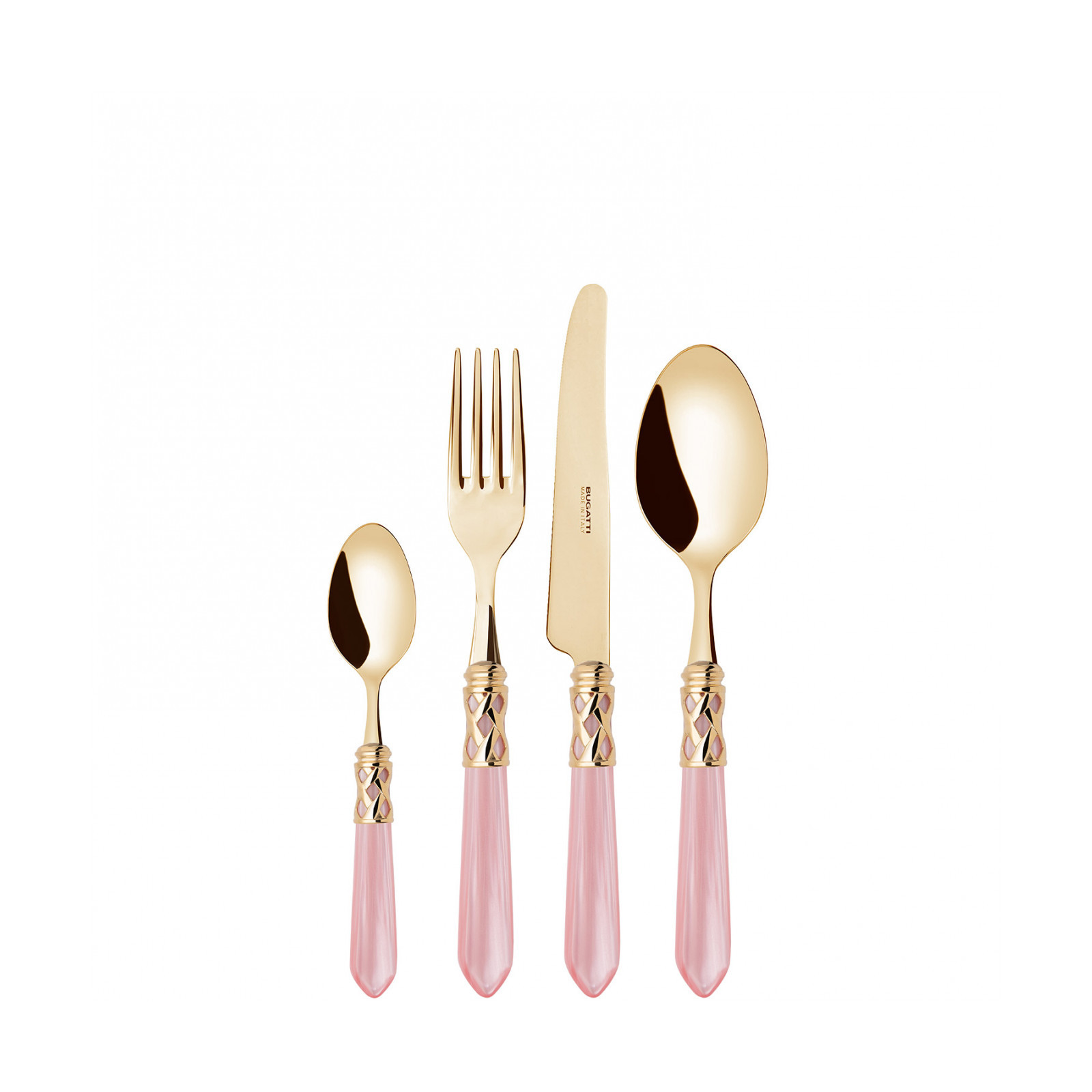 The coloured Aladdin Gold cutlery range was created to bring magic and performance to your table. Each individual piece is made with meticulous care; made of PVD Gold 18/10 stainless steel, the cutlery features an elegant acrylic handle combined with a refined braided ring with a golden finish.