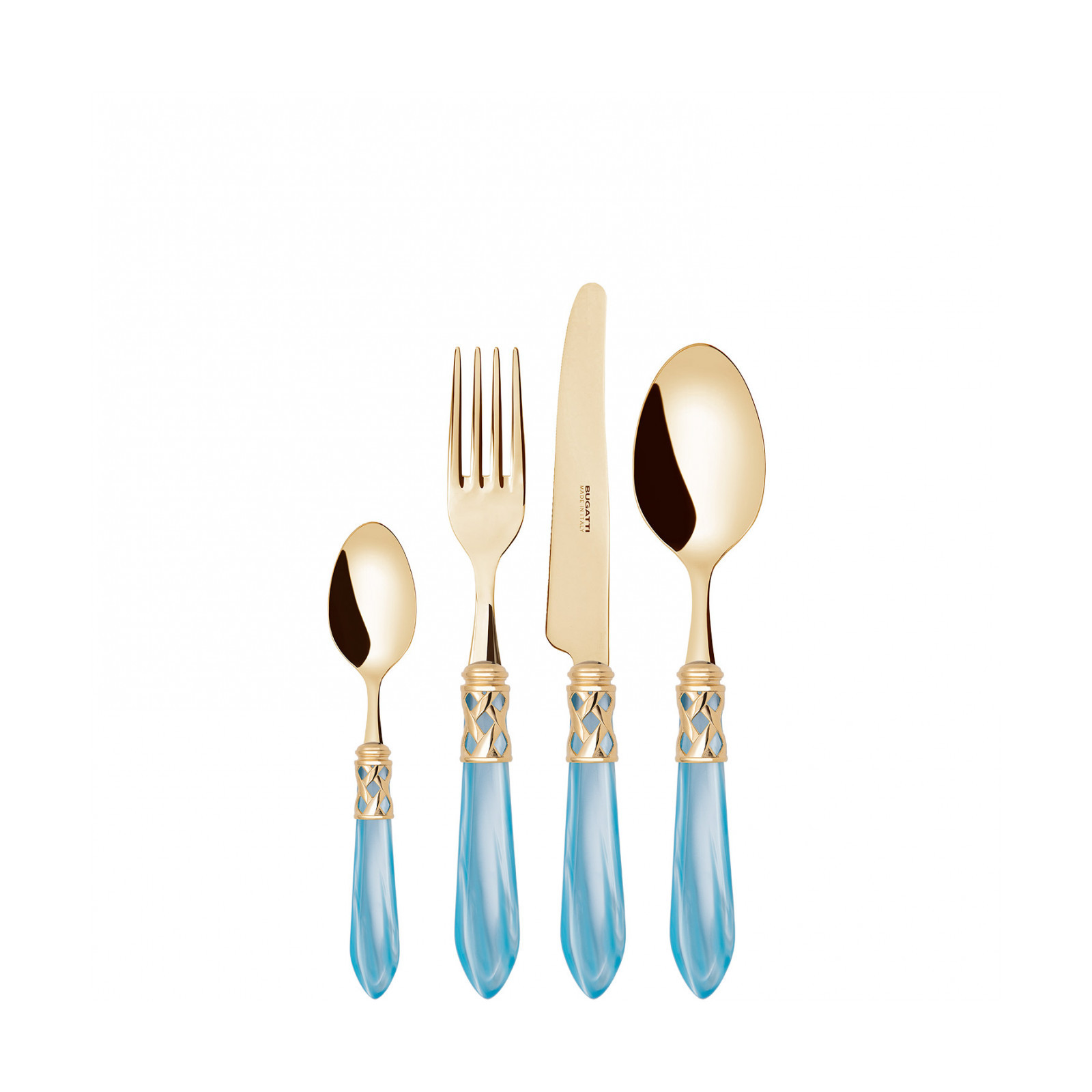 The coloured Aladdin Gold cutlery range was created to bring magic and performance to your table. Each individual piece is made with meticulous care; made of PVD Gold 18/10 stainless steel, the cutlery features an elegant acrylic handle combined with a refined braided ring with a golden finish.
