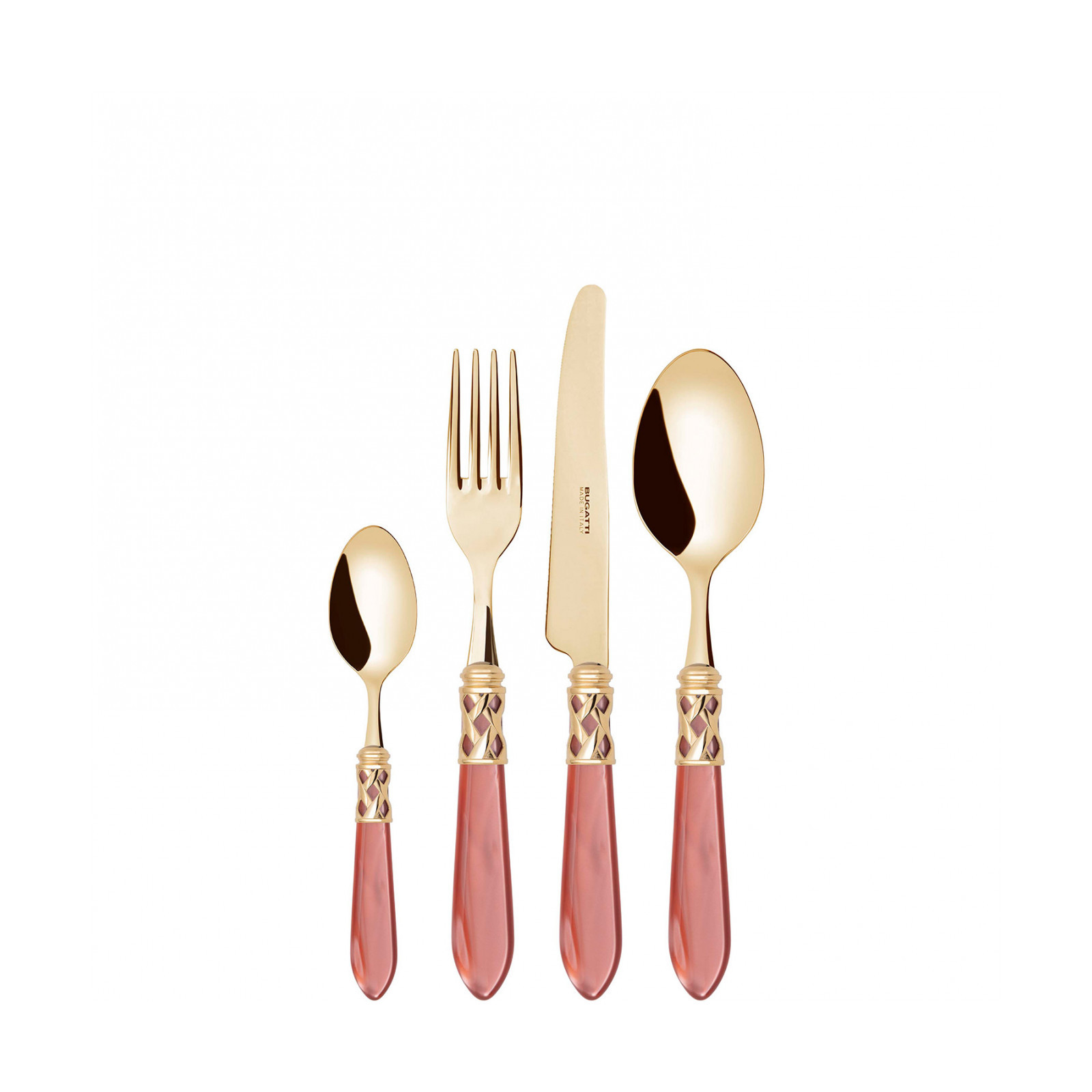 The coloured Aladdin Gold cutlery range was created to bring magic and performance to your table. Each individual piece is made with meticulous care; made of PVD Gold 18/10 stainless steel, the cutlery features an elegant acrylic handle combined with a refined braided ring with a golden finish.