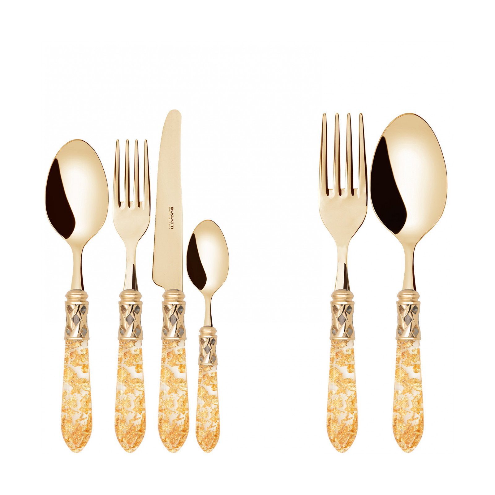 The coloured Aladdin Gold cutlery range was created to bring magic and performance to your table. Each individual piece is made with meticulous care; made of PVD Gold 18/10 stainless steel, the cutlery features an elegant acrylic handle combined with a refined braided ring with a golden finish.