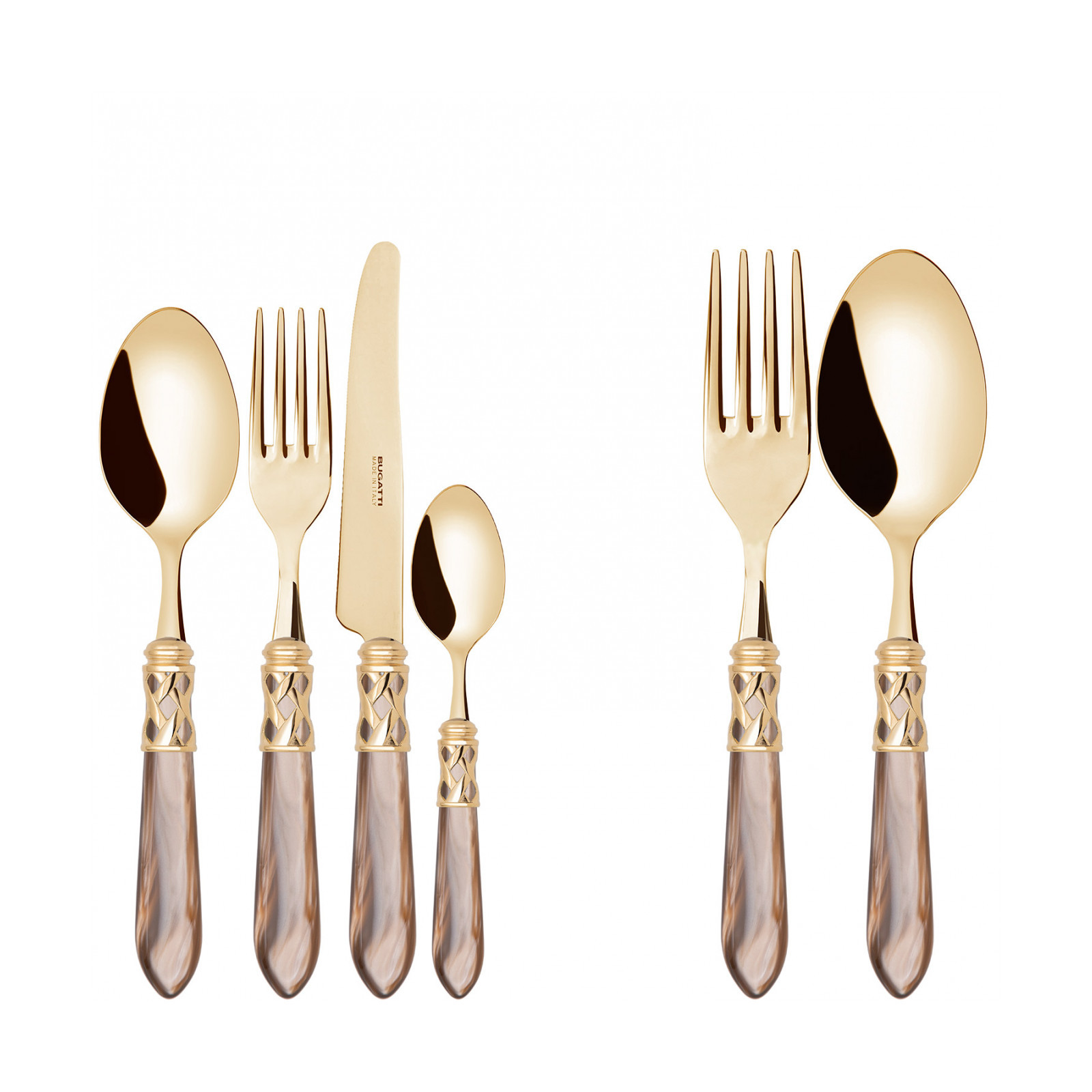 The coloured Aladdin Gold cutlery range was created to bring magic and performance to your table. Each individual piece is made with meticulous care; made of PVD Gold 18/10 stainless steel, the cutlery features an elegant acrylic handle combined with a refined braided ring with a golden finish.