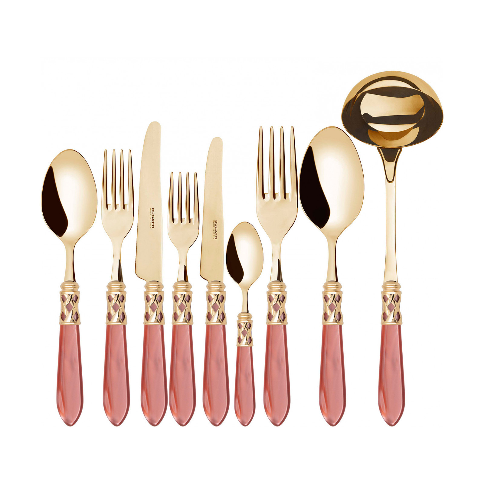The coloured Aladdin Gold cutlery range was created to bring magic and performance to your table. Each individual piece is made with meticulous care; made of PVD Gold 18/10 stainless steel, the cutlery features an elegant acrylic handle combined with a refined braided ring with a golden finish.