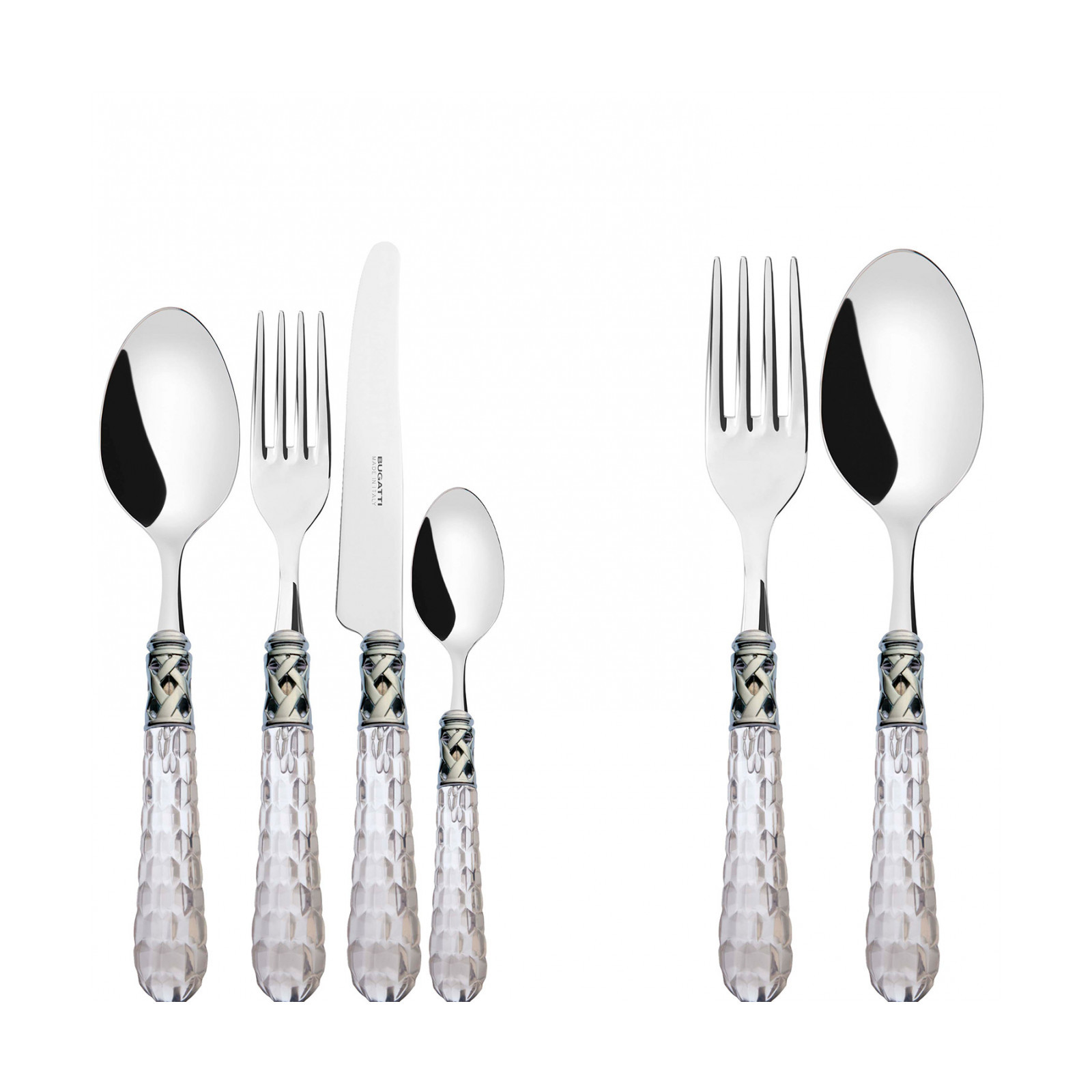 The Bohemia Shining Ring coloured cutlery set decorates your table in tasteful yet unconventional style. The design of this 18/10 stainless steel cutlery set is centred on a polished steel braided ring and a finely decorated translucent coloured handle shaped with multiple facets reminiscent of crystal surfaces. This cutlery is dishwasher safe.