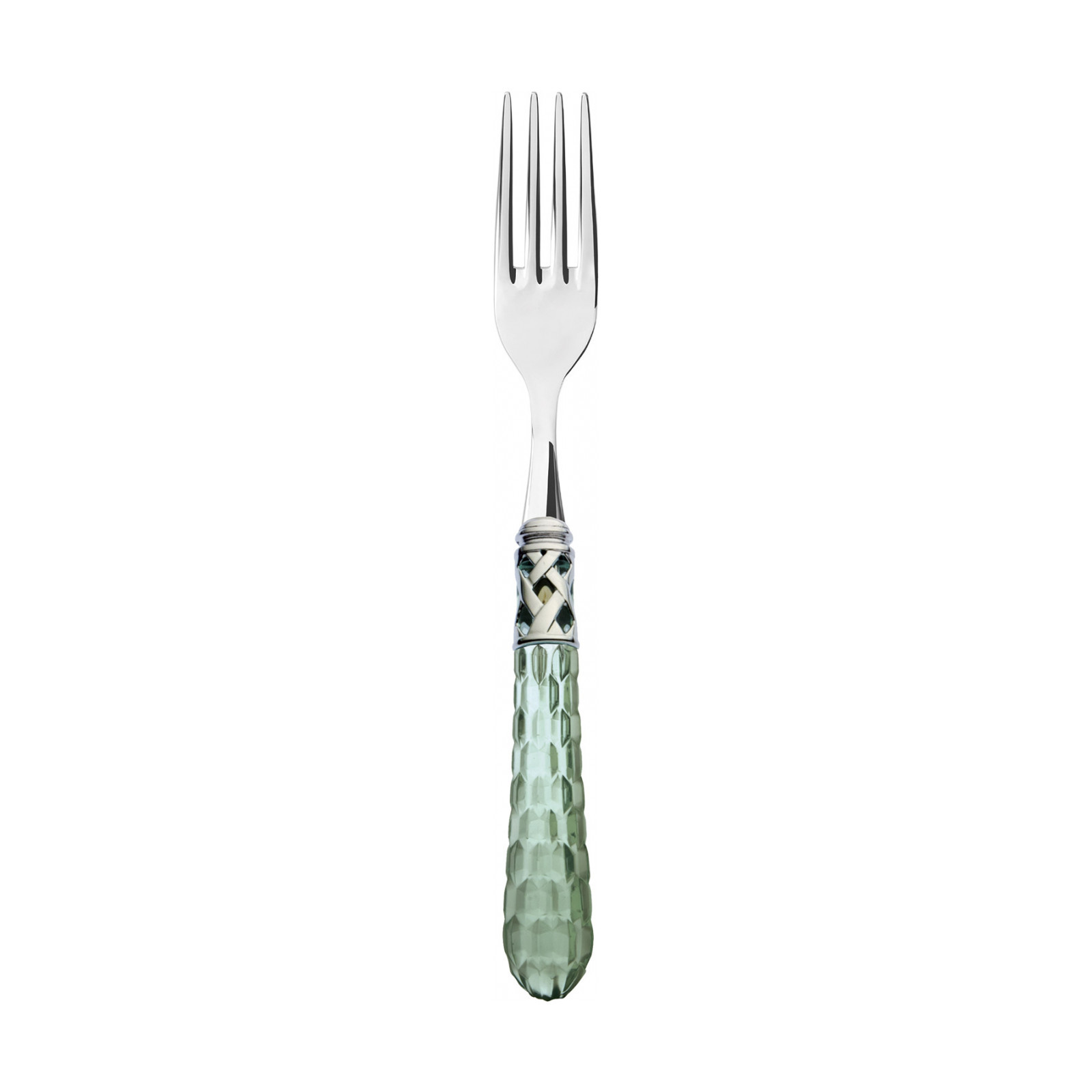 The Bohemia Shining Ring coloured cutlery set decorates your table in tasteful yet unconventional style. The design of this 18/10 stainless steel cutlery set is centred on a polished steel braided ring and a finely decorated translucent coloured handle shaped with multiple facets reminiscent of crystal surfaces. This cutlery is dishwasher safe.