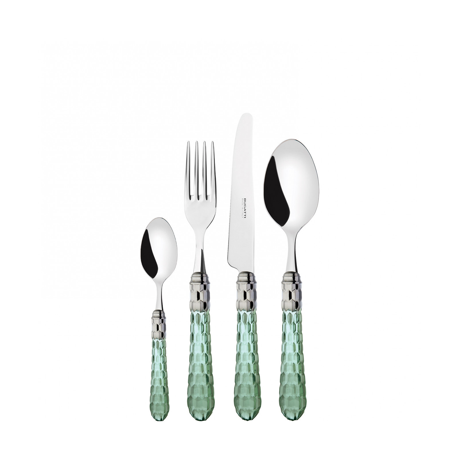 Cristallo Shining Ring coloured cutlery features a polished steel coloured ring and a transparent handle embellished with numerous crystal-like facets. The Cristallo cutlery set is the original choice for those who want to decorate their table with authentic tableware jewels. This cutlery range is made from 18/10 stainless steel and is dishwasher safe.