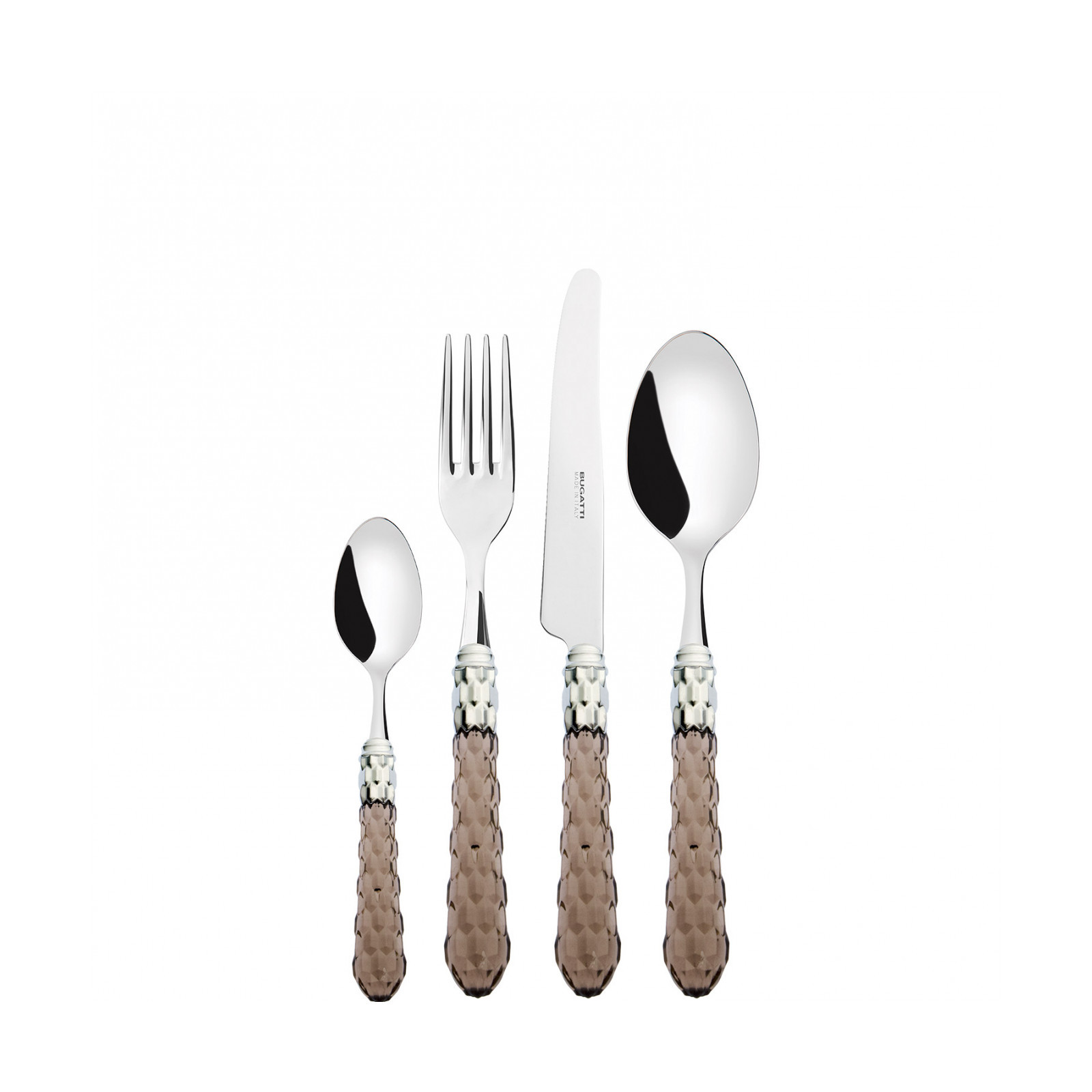 Cristallo Shining Ring coloured cutlery features a polished steel coloured ring and a transparent handle embellished with numerous crystal-like facets. The Cristallo cutlery set is the original choice for those who want to decorate their table with authentic tableware jewels. This cutlery range is made from 18/10 stainless steel and is dishwasher safe.