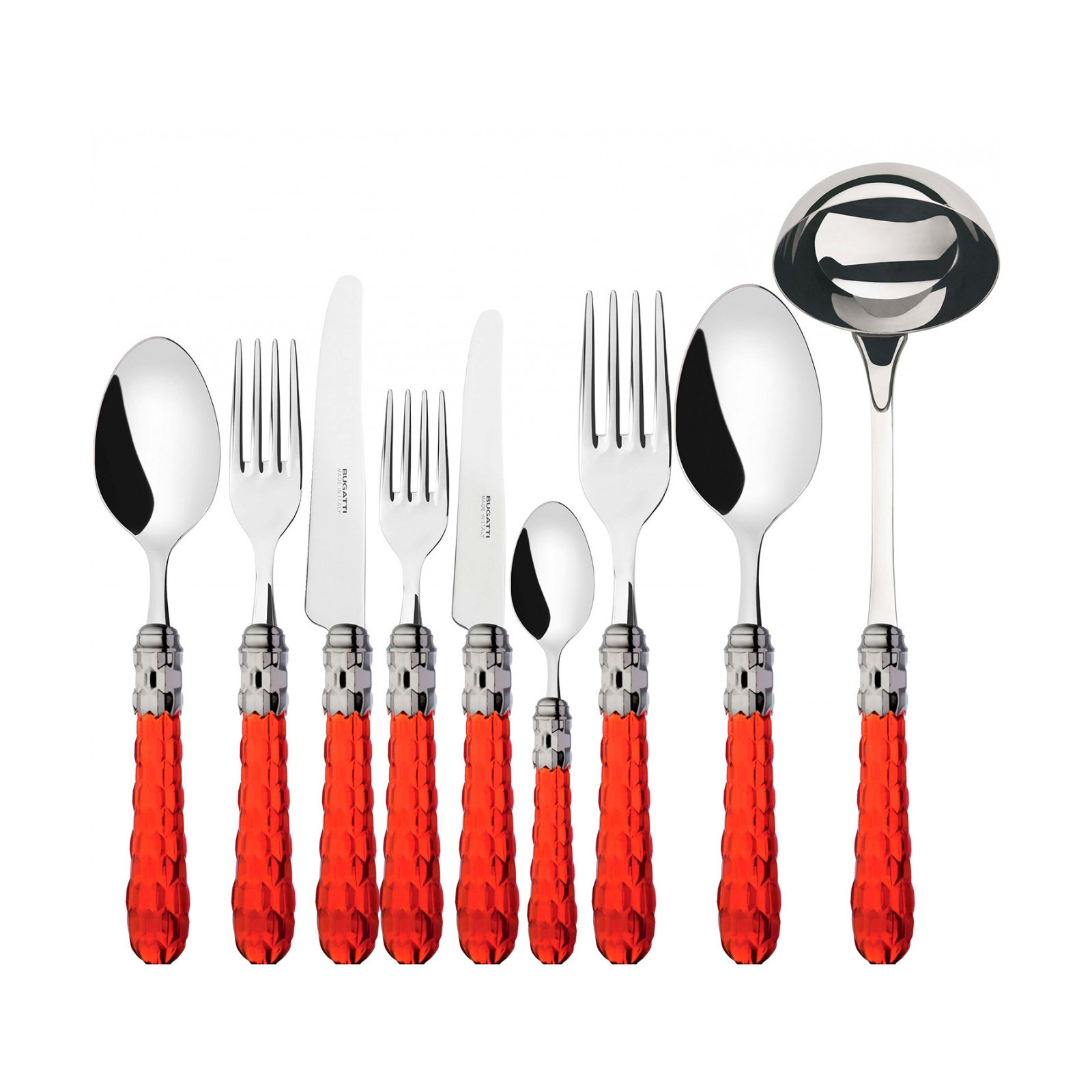 Cristallo Shining Ring coloured cutlery features a polished steel coloured ring and a transparent handle embellished with numerous crystal-like facets. The Cristallo cutlery set is the original choice for those who want to decorate their table with authentic tableware jewels. This cutlery range is made from 18/10 stainless steel and is dishwasher safe.