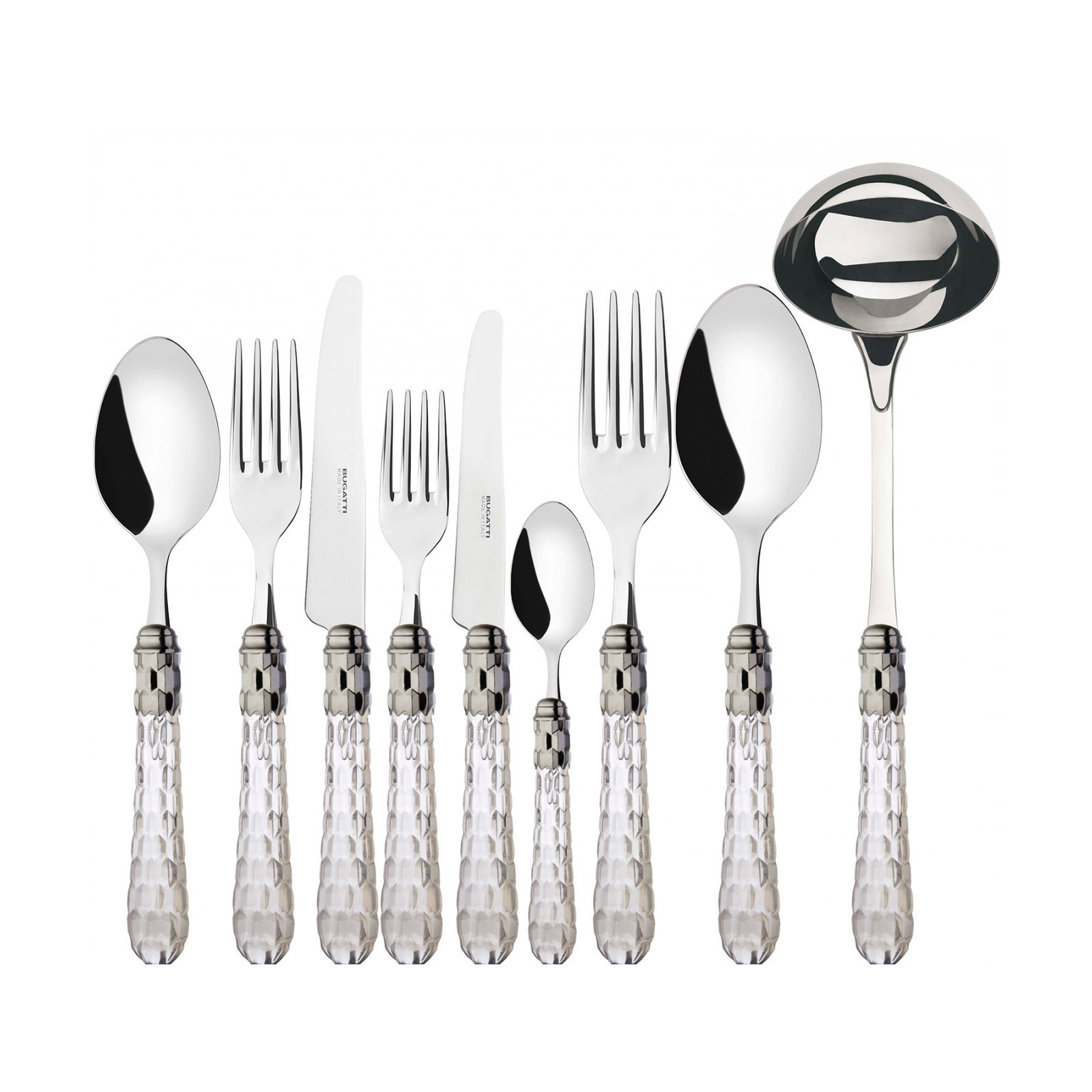 Cristallo Shining Ring coloured cutlery features a polished steel coloured ring and a transparent handle embellished with numerous crystal-like facets. The Cristallo cutlery set is the original choice for those who want to decorate their table with authentic tableware jewels. This cutlery range is made from 18/10 stainless steel and is dishwasher safe.