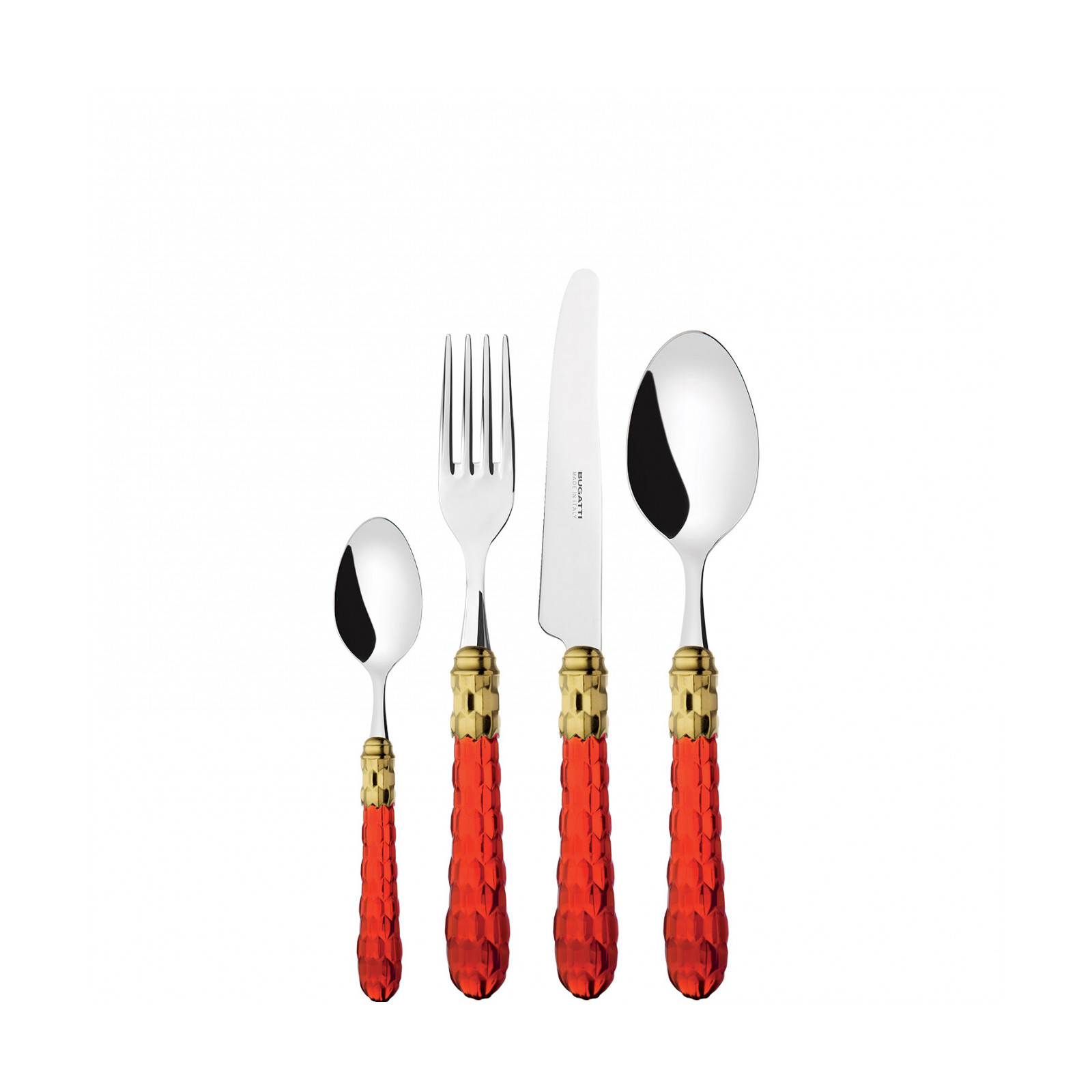Cristallo Gold-Plated Ring coloured cutlery features a gold-plated ring and a transparent handle embellished with numerous crystal-like facets. The Cristallo cutlery set is the original choice for those who want to decorate their table with authentic tableware jewels. This cutlery range is made of 18/10 stainless steel.