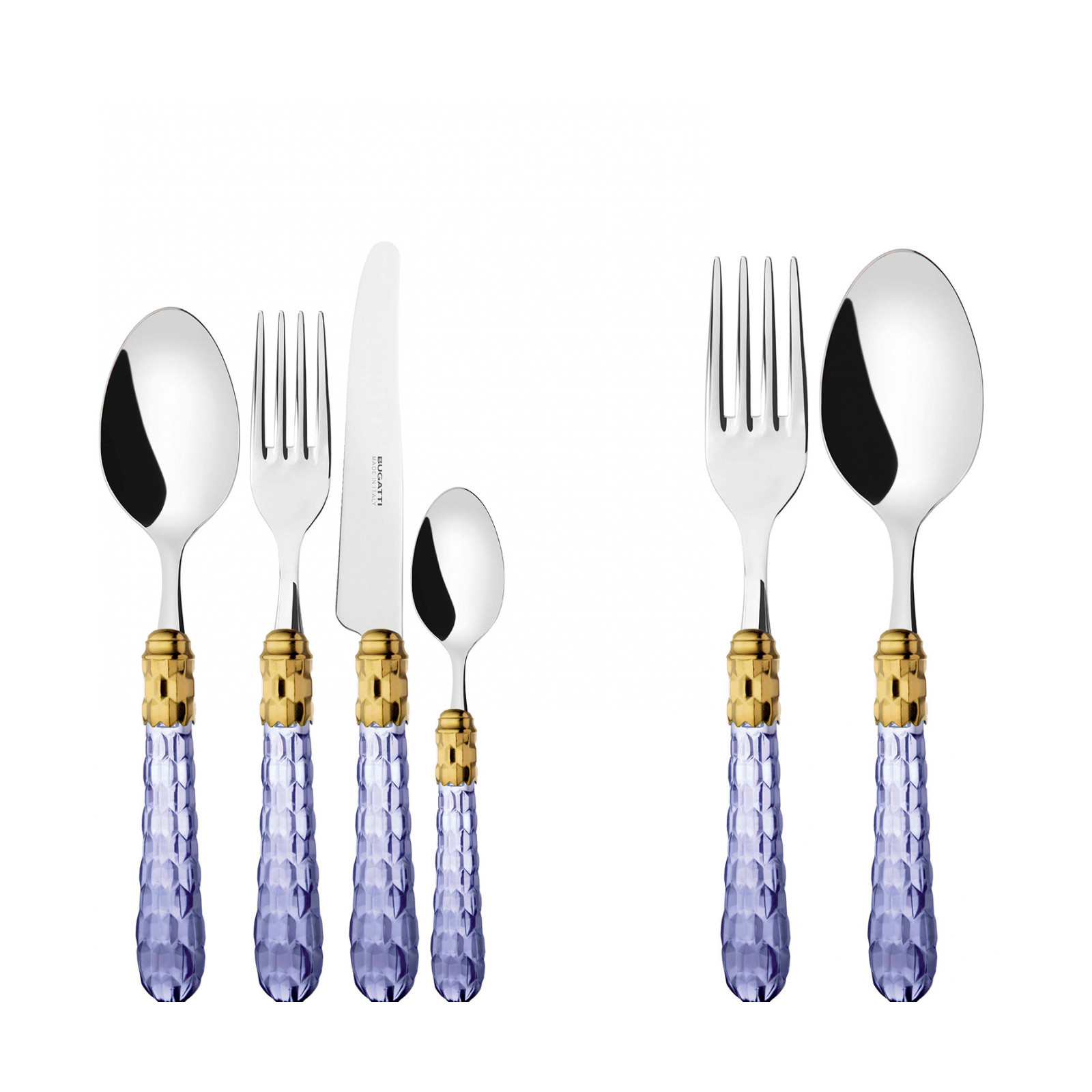 Cristallo Gold-Plated Ring coloured cutlery features a gold-plated ring and a transparent handle embellished with numerous crystal-like facets. The Cristallo cutlery set is the original choice for those who want to decorate their table with authentic tableware jewels. This cutlery range is made of 18/10 stainless steel.