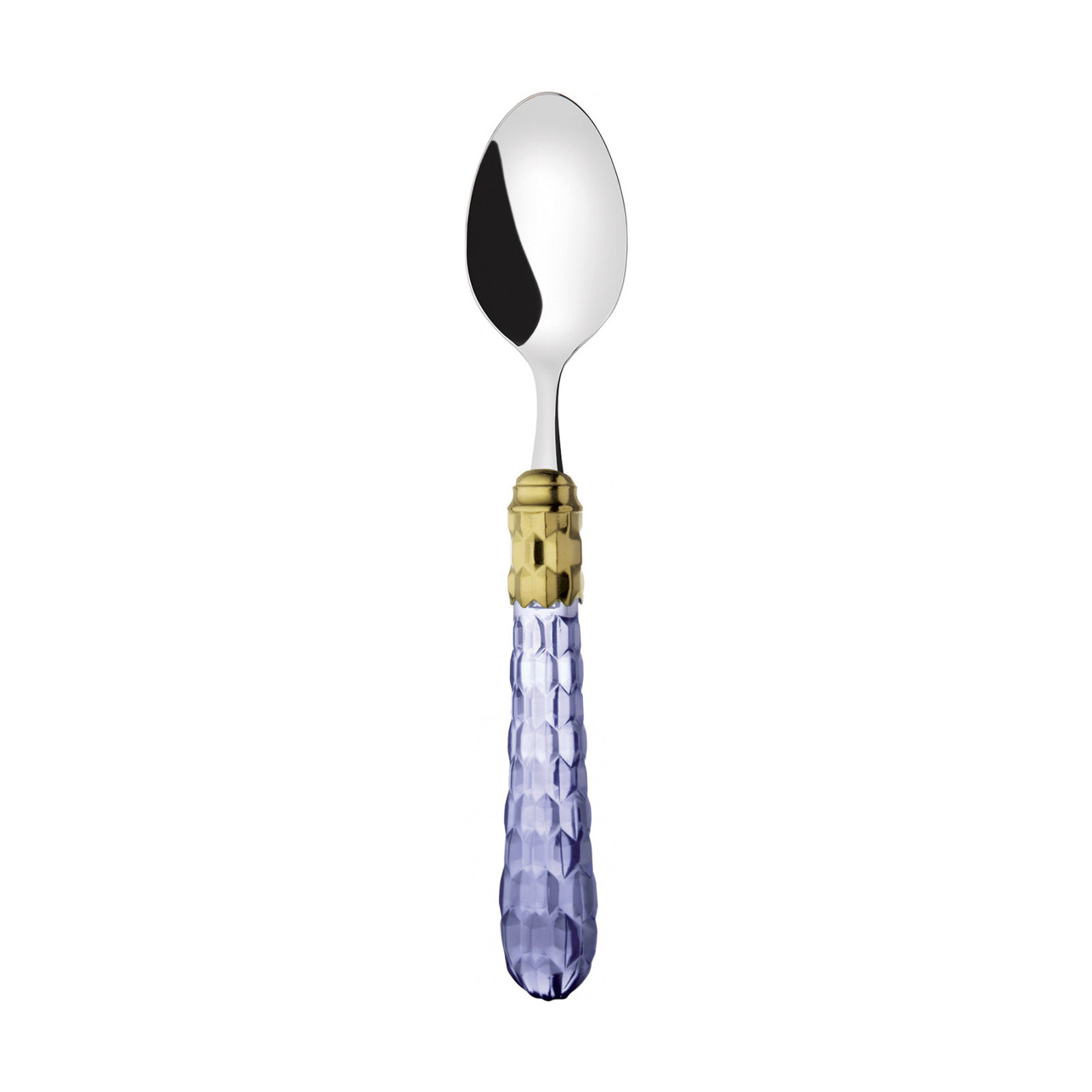 Cristallo Gold-Plated Ring coloured cutlery features a gold-plated ring and a transparent handle embellished with numerous crystal-like facets. The Cristallo cutlery set is the original choice for those who want to decorate their table with authentic tableware jewels. This cutlery range is made of 18/10 stainless steel.