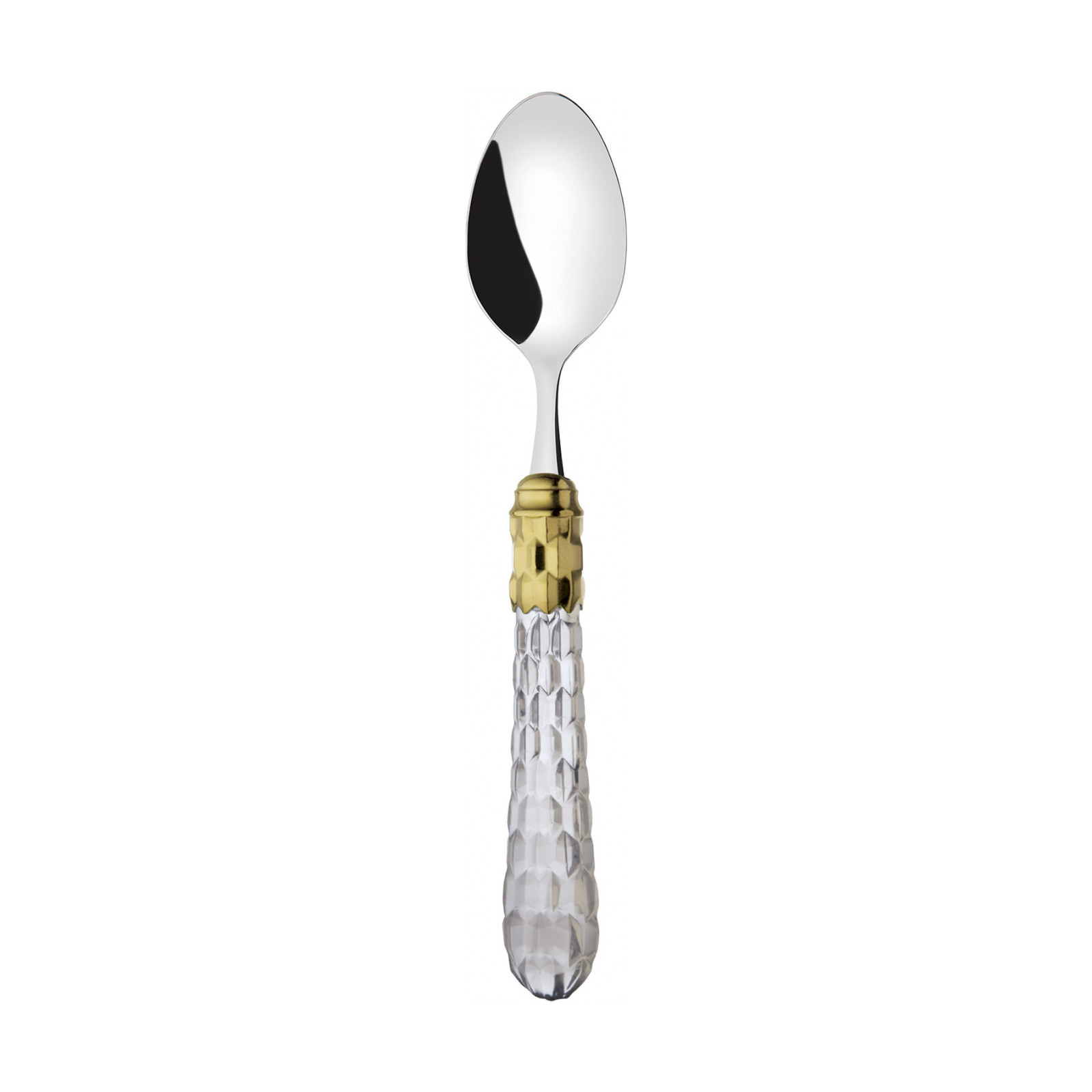 Cristallo Gold-Plated Ring coloured cutlery features a gold-plated ring and a transparent handle embellished with numerous crystal-like facets. The Cristallo cutlery set is the original choice for those who want to decorate their table with authentic tableware jewels. This cutlery range is made of 18/10 stainless steel.