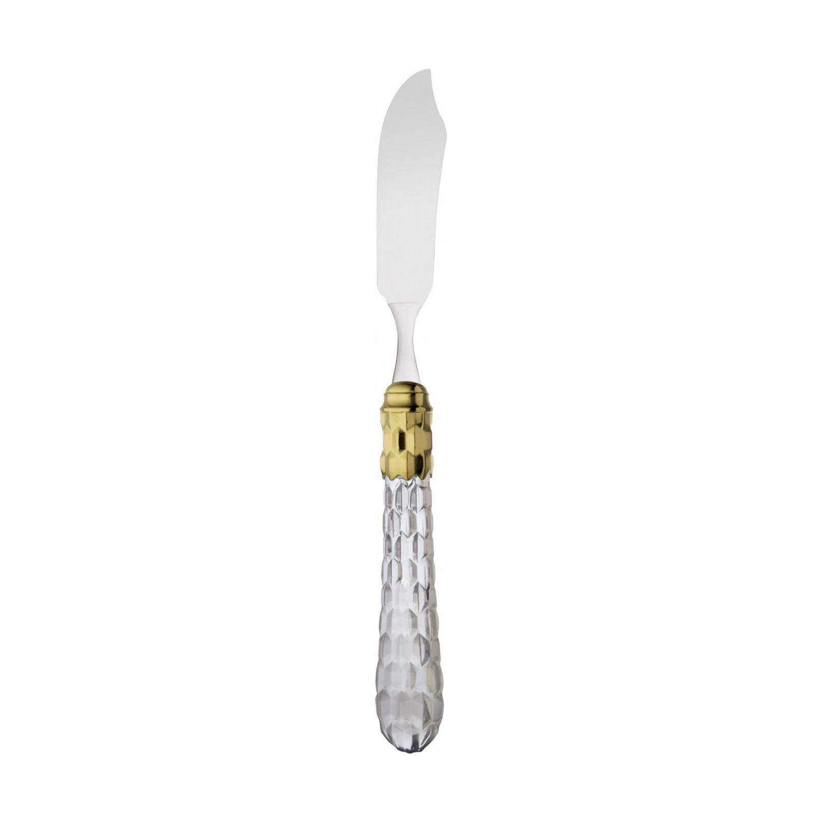 Cristallo Gold-Plated Ring coloured cutlery features a gold-plated ring and a transparent handle embellished with numerous crystal-like facets. The Cristallo cutlery set is the original choice for those who want to decorate their table with authentic tableware jewels. This cutlery range is made of 18/10 stainless steel.