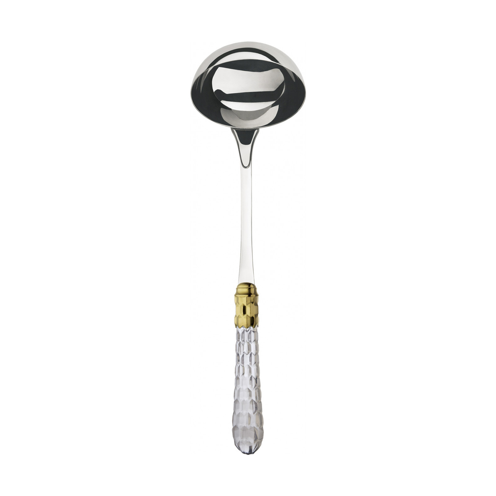 Cristallo Gold-Plated Ring coloured cutlery features a gold-plated ring and a transparent handle embellished with numerous crystal-like facets. The Cristallo cutlery set is the original choice for those who want to decorate their table with authentic tableware jewels. This cutlery range is made of 18/10 stainless steel.