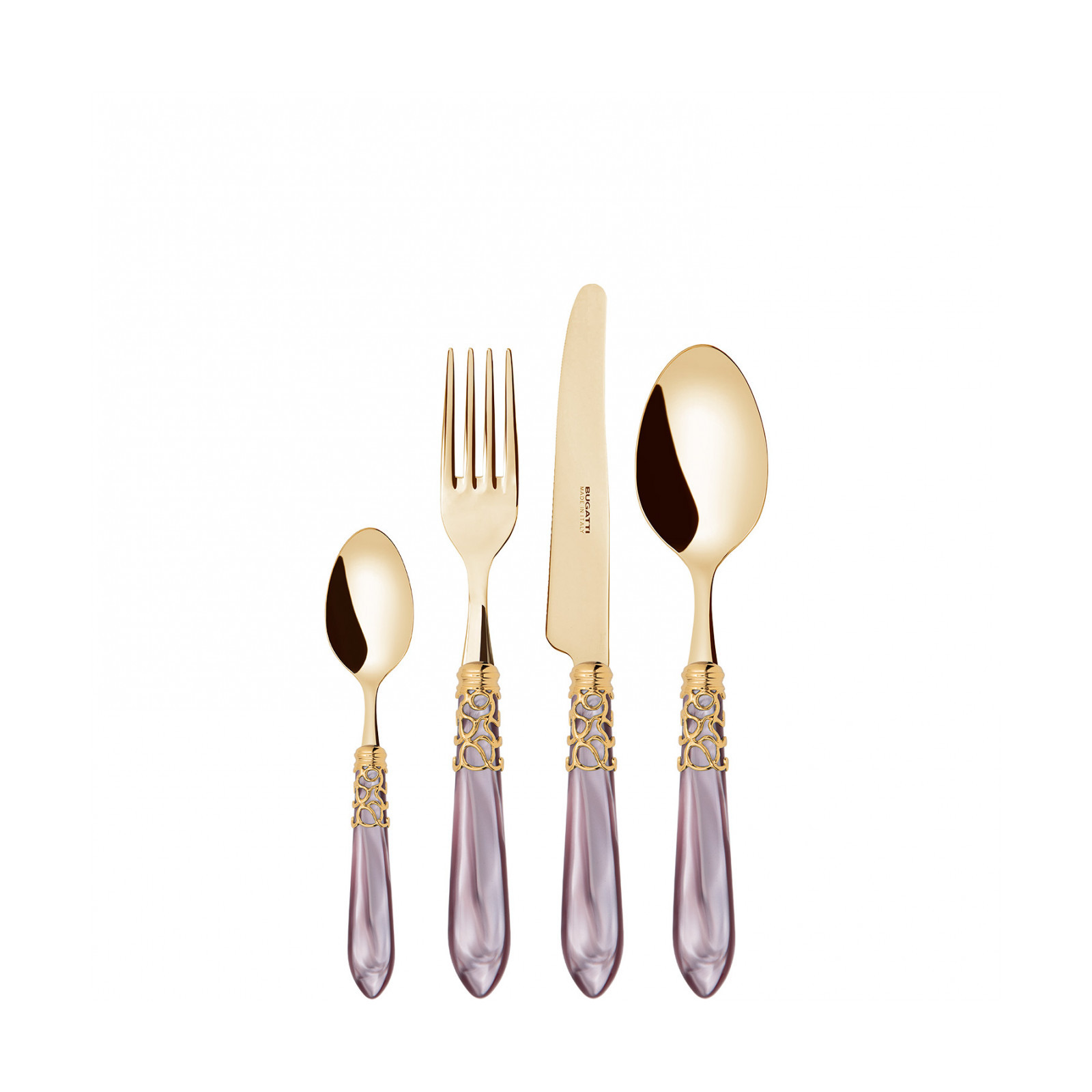Choose the Melody Gold coloured cutlery set to enchant and captivate your guests at the table. Each piece is crafted with meticulous care and attention in gold PVD-coated 18/10 stainless steel. The elegant acrylic handle and a precious ring with a gold finish recalls the intertwined melodic notes of a memorable musical performance.