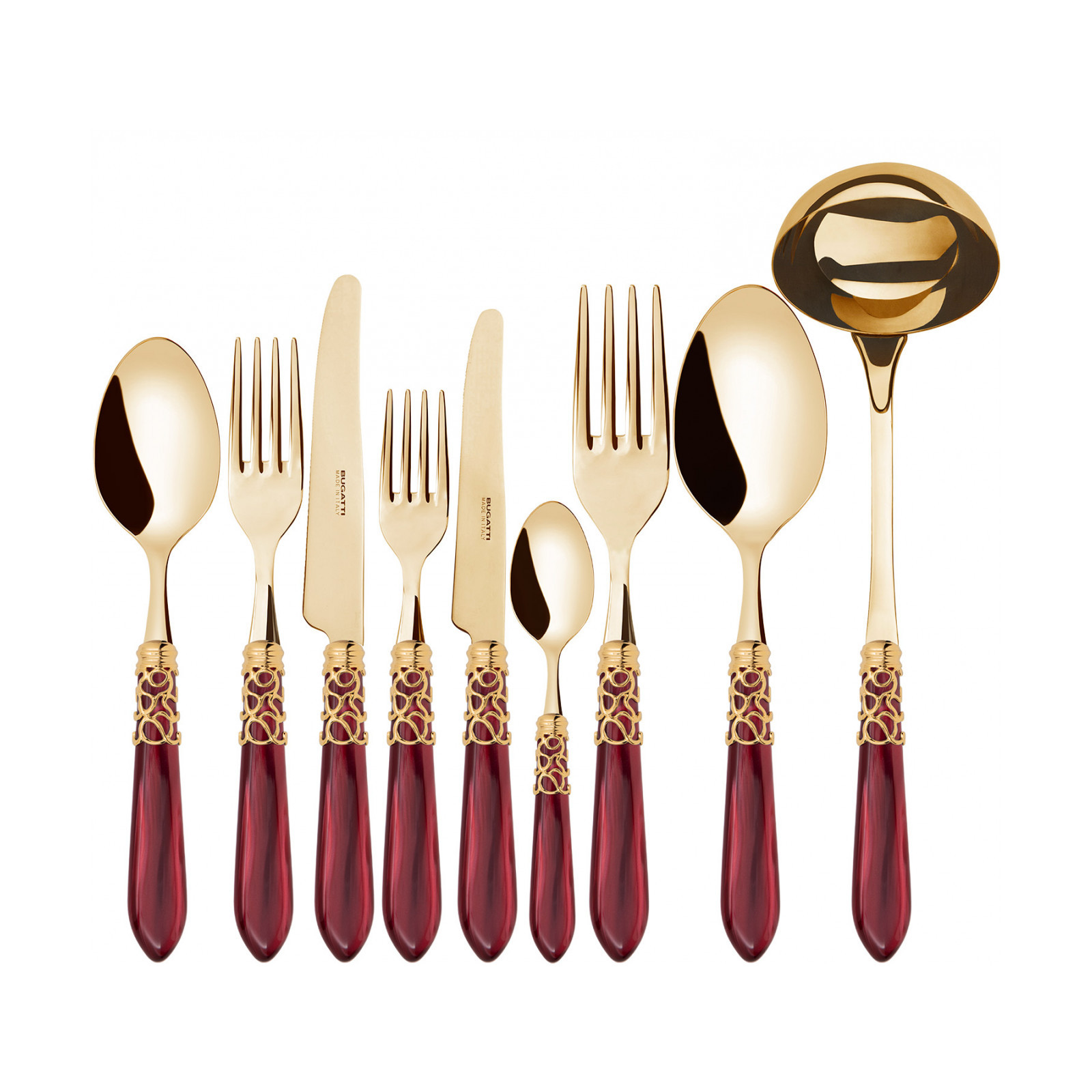 Choose the Melody Gold coloured cutlery set to enchant and captivate your guests at the table. Each piece is crafted with meticulous care and attention in gold PVD-coated 18/10 stainless steel. The elegant acrylic handle and a precious ring with a gold finish recalls the intertwined melodic notes of a memorable musical performance.