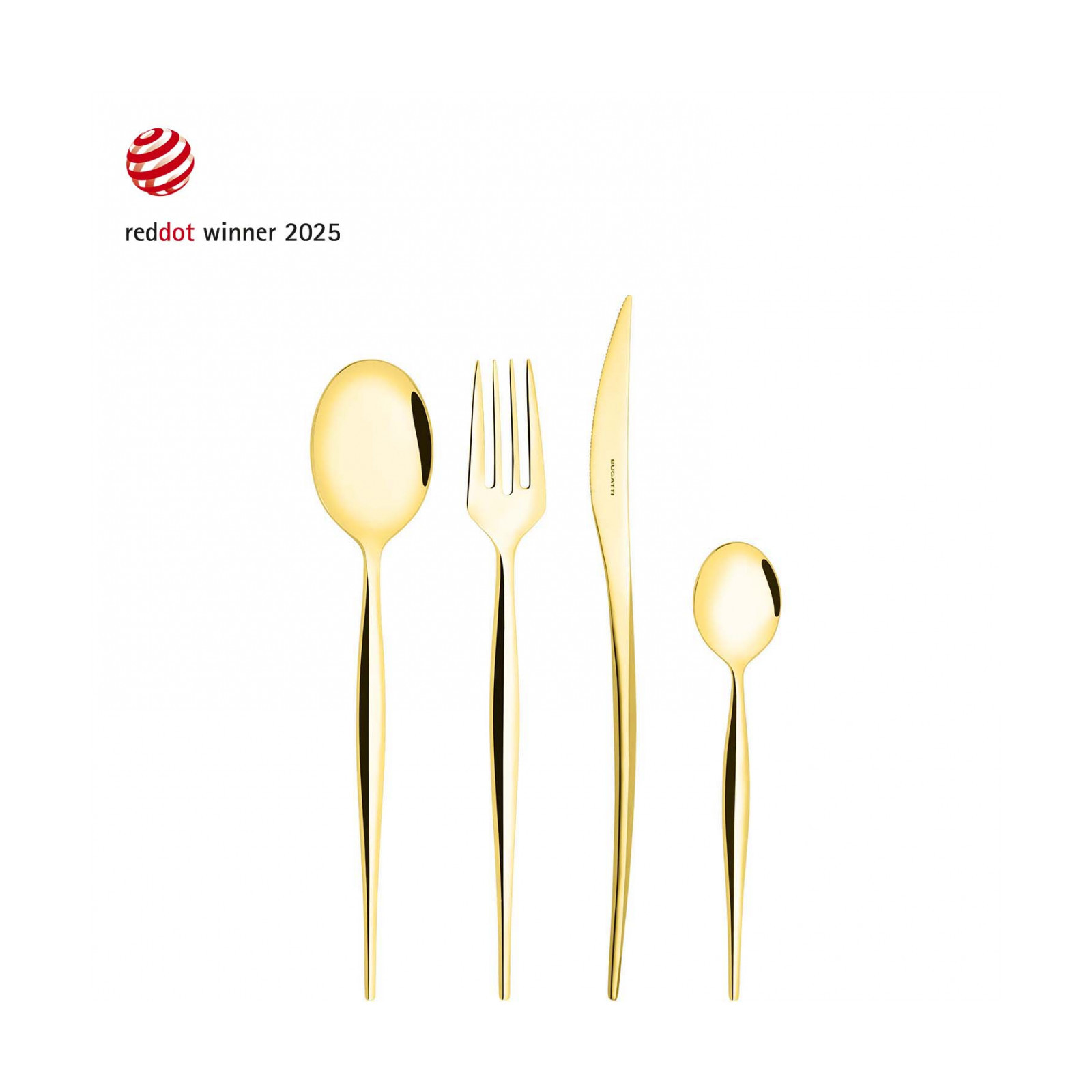 Born from the inspiration of a blade of grass on a lovely spring day, the Natura Gold cutlery is designed to bring wonder and amazement to the table. The elongated shapes, the purity of the design and the minimal and original style make Natura cutlery a modern and elegant combination to decorate your table with a refined unexpected touch. Made of 18/10 stainless steel with gold pvd finishing, 5 mm thick, Natura cutlery combines the quality of materials with a unique shape.