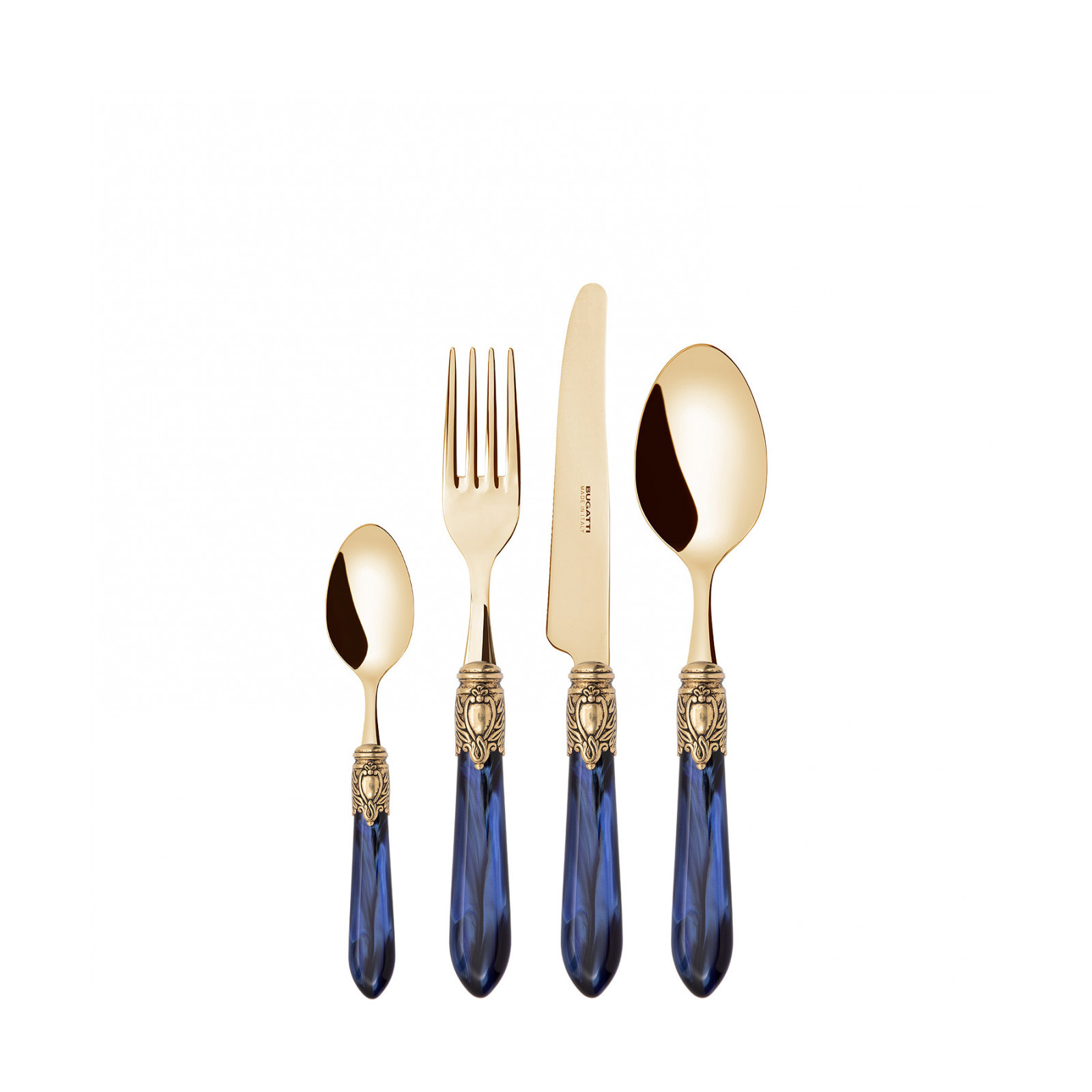 Observe the most important rules of etiquette by bringing Oxford Gold coloured cutlery to the table. To ensure an elegant table with a regal spirit, each piece in the Oxford range is made of gold PVD-coated 18/10 stainless steel, with an acrylic handle embellished with a sophisticated antique gold-finished ring that resembles a noble coat of arms. The Oxford Gold cutlery range is the perfect accessory to ensure an even more elegant and regal table setting.