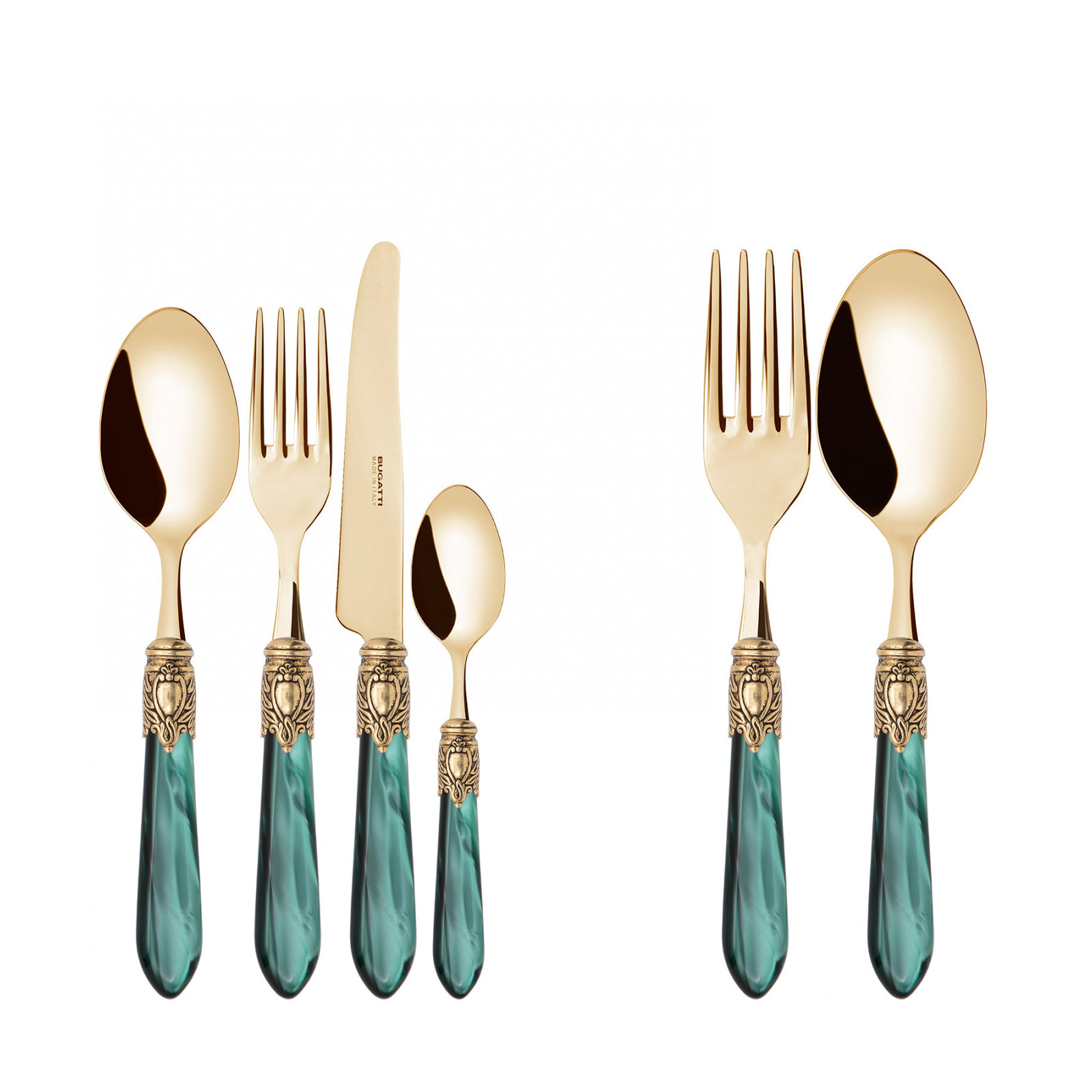Observe the most important rules of etiquette by bringing Oxford Gold coloured cutlery to the table. To ensure an elegant table with a regal spirit, each piece in the Oxford range is made of gold PVD-coated 18/10 stainless steel, with an acrylic handle embellished with a sophisticated antique gold-finished ring that resembles a noble coat of arms. The Oxford Gold cutlery range is the perfect accessory to ensure an even more elegant and regal table setting.