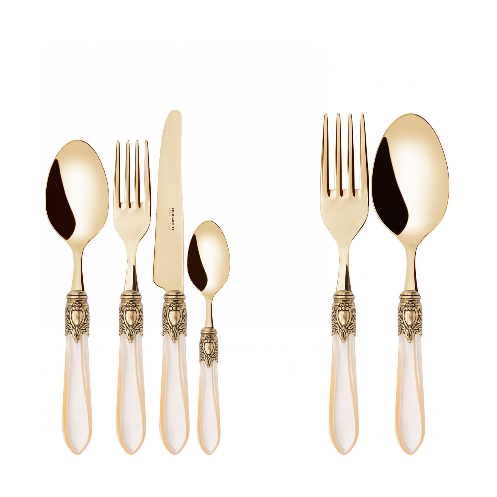 Observe the most important rules of etiquette by bringing Oxford Gold coloured cutlery to the table. To ensure an elegant table with a regal spirit, each piece in the Oxford range is made of gold PVD-coated 18/10 stainless steel, with an acrylic handle embellished with a sophisticated antique gold-finished ring that resembles a noble coat of arms. The Oxford Gold cutlery range is the perfect accessory to ensure an even more elegant and regal table setting.