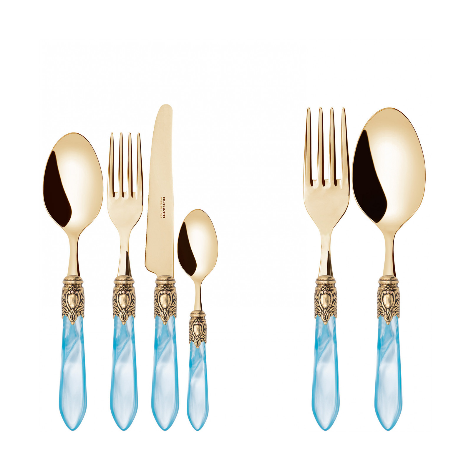 Observe the most important rules of etiquette by bringing Oxford Gold coloured cutlery to the table. To ensure an elegant table with a regal spirit, each piece in the Oxford range is made of gold PVD-coated 18/10 stainless steel, with an acrylic handle embellished with a sophisticated antique gold-finished ring that resembles a noble coat of arms. The Oxford Gold cutlery range is the perfect accessory to ensure an even more elegant and regal table setting.