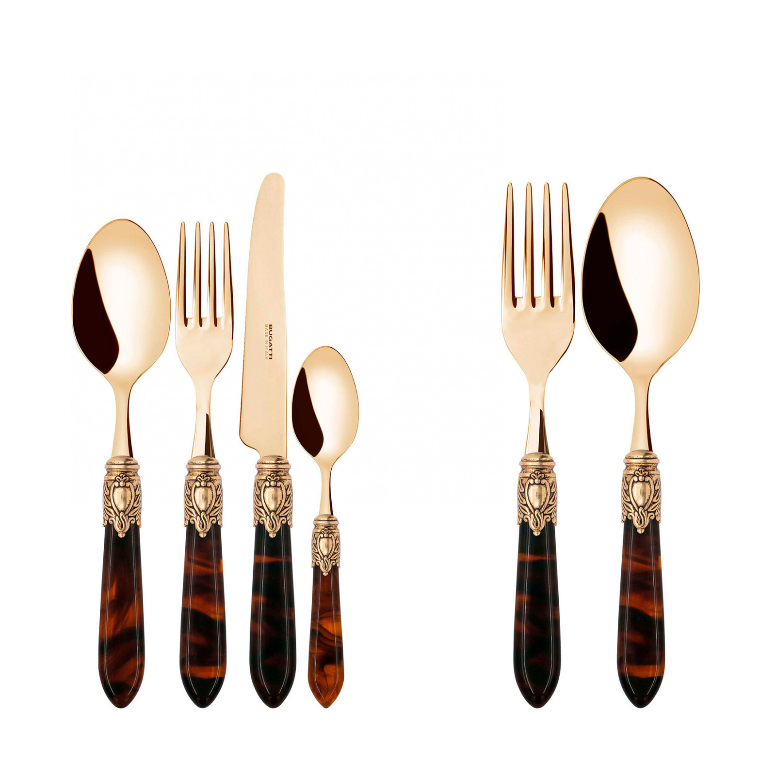 Observe the most important rules of etiquette by bringing Oxford Gold coloured cutlery to the table. To ensure an elegant table with a regal spirit, each piece in the Oxford range is made of gold PVD-coated 18/10 stainless steel, with an acrylic handle embellished with a sophisticated antique gold-finished ring that resembles a noble coat of arms. The Oxford Gold cutlery range is the perfect accessory to ensure an even more elegant and regal table setting.