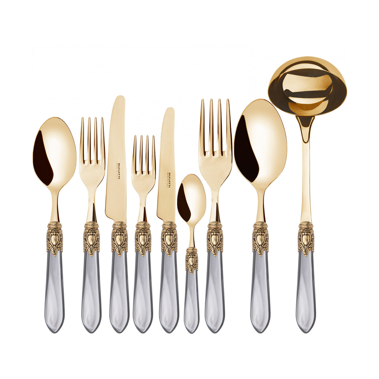Observe the most important rules of etiquette by bringing Oxford Gold coloured cutlery to the table. To ensure an elegant table with a regal spirit, each piece in the Oxford range is made of gold PVD-coated 18/10 stainless steel, with an acrylic handle embellished with a sophisticated antique gold-finished ring that resembles a noble coat of arms. The Oxford Gold cutlery range is the perfect accessory to ensure an even more elegant and regal table setting.