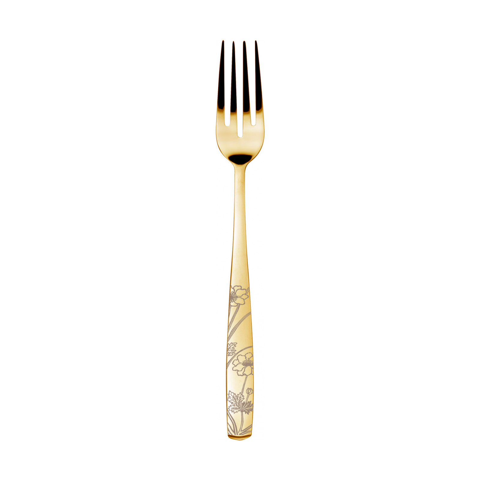 The Riviera Lady Black Gold line of 18/10 stainless steel gold PVD-coated cutlery is enveloped in a refined floral motif, bringing to your table the essence of the garden of wonders from which it takes its inspiration, fashionably enhancing its elegance. This decorated cutlery motif was hand-drawn by the designer Alessandro Parascandolo and engraved on the cutlery pieces. The knife is forged in one piece. This cutlery is dishwasher safe.