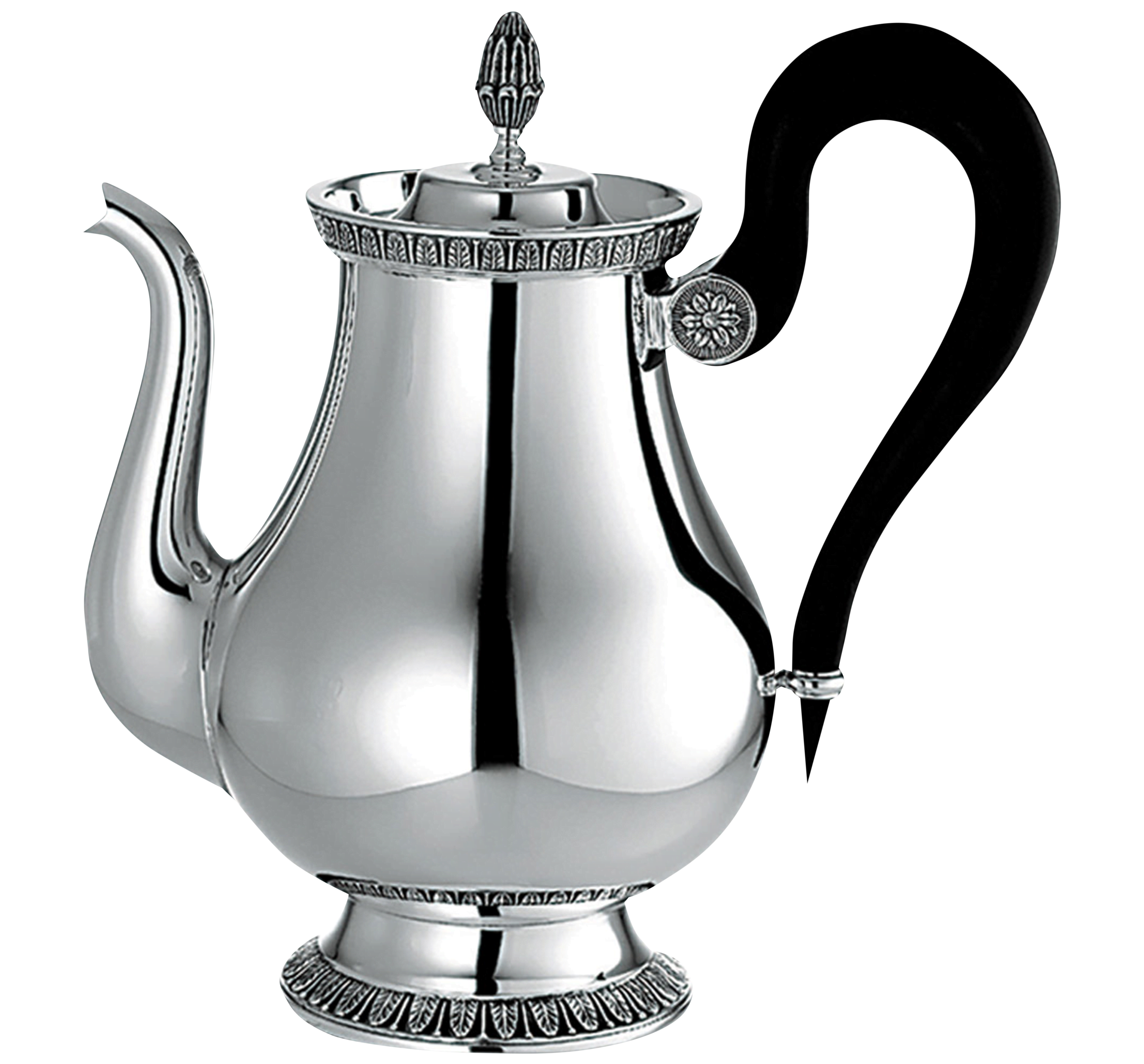 Посеребрённый чайник Malmaison с ручкой из тёмного дерева рассчитан на 8 чашек и подходит для классической чайной сервировки. Модель продолжает историческую эстетику коллекции с орнаментом в духе ампира и хорошо сочетается с сахарницей и сливочником той же линии.