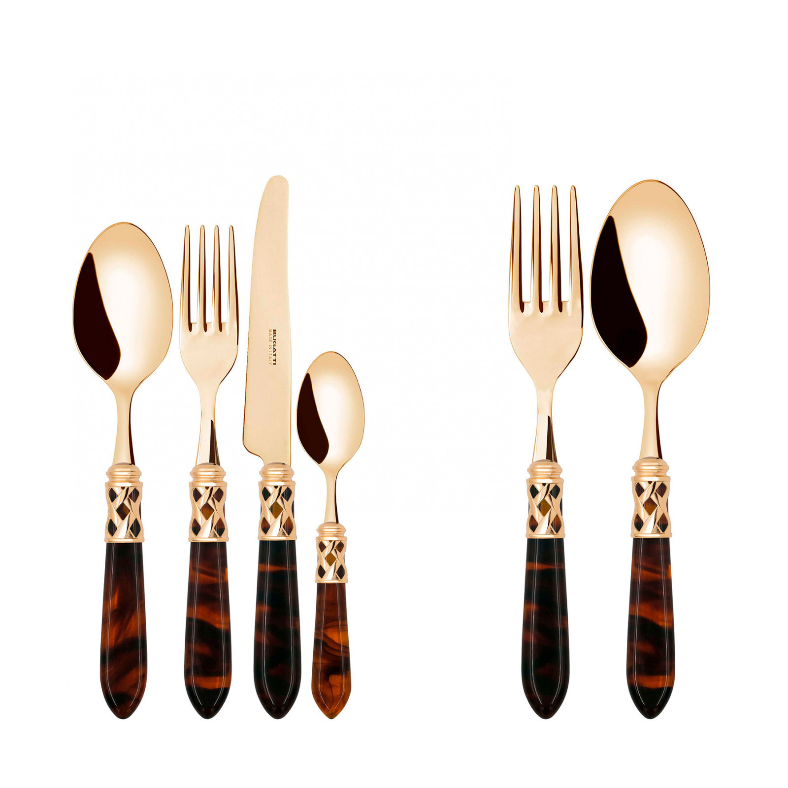 The coloured Aladdin Gold cutlery range was created to bring magic and performance to your table. Each individual piece is made with meticulous care; made of PVD Gold 18/10 stainless steel, the cutlery features an elegant acrylic handle combined with a refined braided ring with a golden finish.
