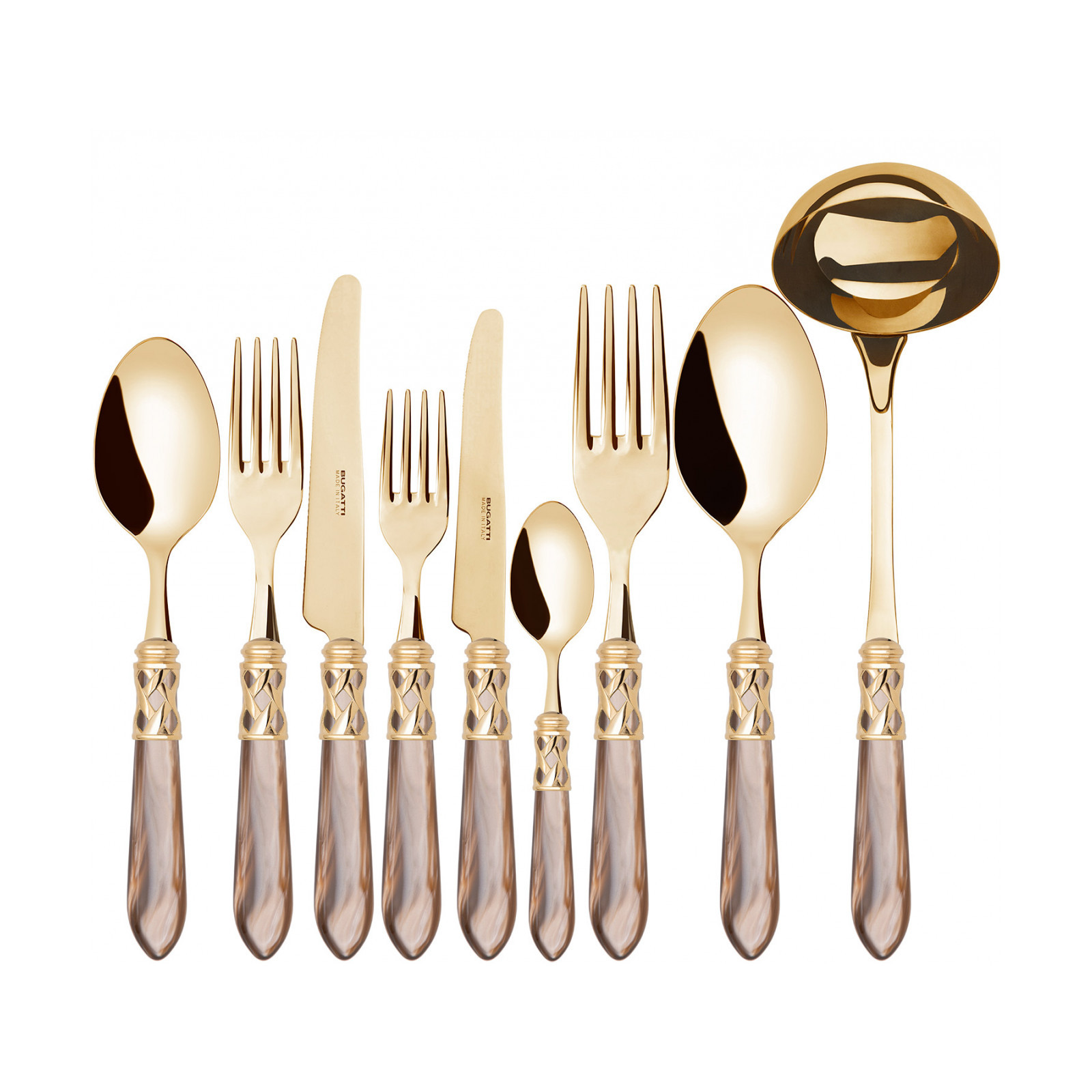 The coloured Aladdin Gold cutlery range was created to bring magic and performance to your table. Each individual piece is made with meticulous care; made of PVD Gold 18/10 stainless steel, the cutlery features an elegant acrylic handle combined with a refined braided ring with a golden finish.