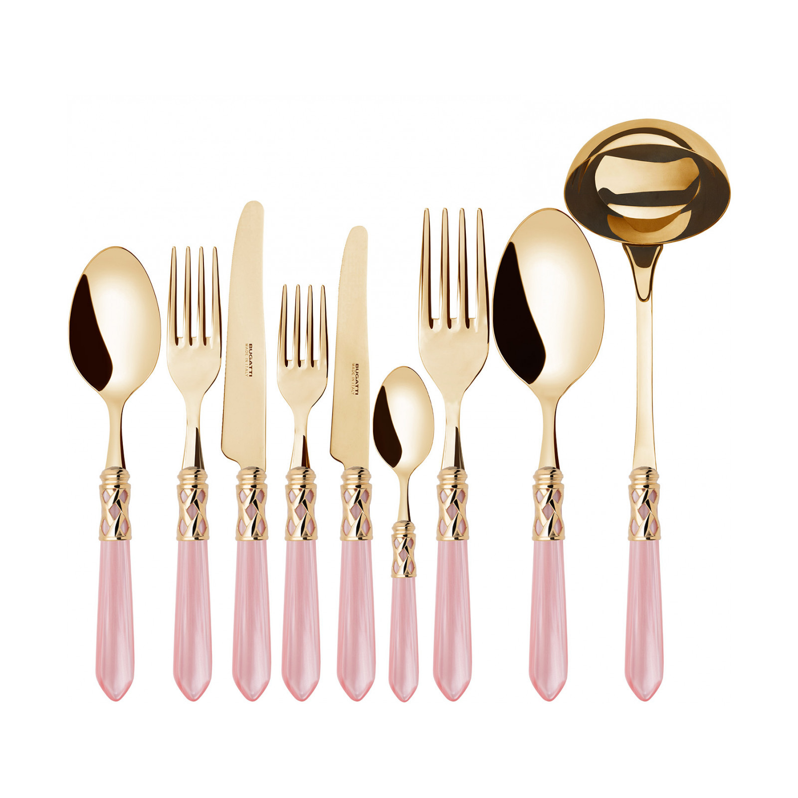 The coloured Aladdin Gold cutlery range was created to bring magic and performance to your table. Each individual piece is made with meticulous care; made of PVD Gold 18/10 stainless steel, the cutlery features an elegant acrylic handle combined with a refined braided ring with a golden finish.