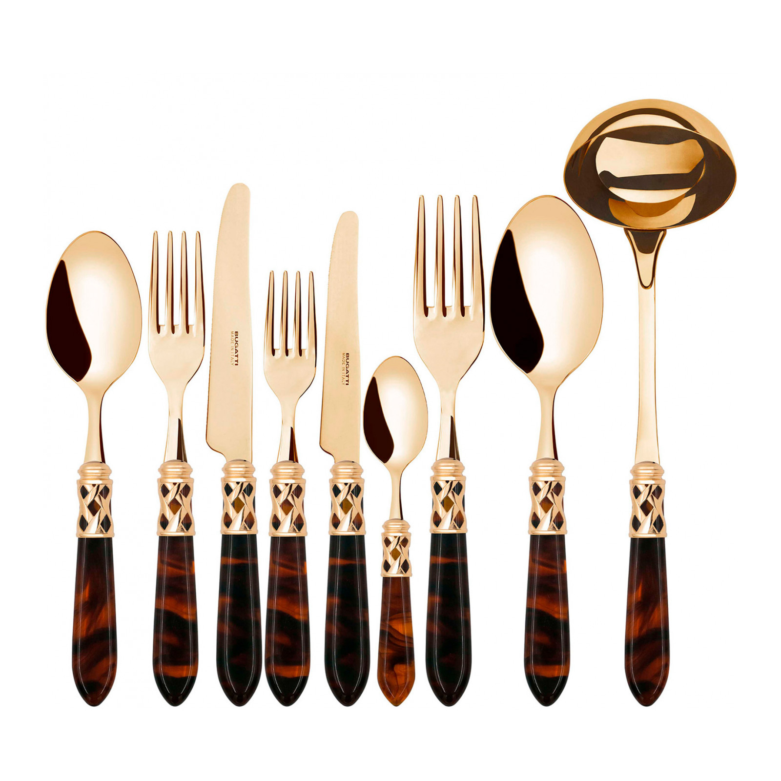 The coloured Aladdin Gold cutlery range was created to bring magic and performance to your table. Each individual piece is made with meticulous care; made of PVD Gold 18/10 stainless steel, the cutlery features an elegant acrylic handle combined with a refined braided ring with a golden finish.