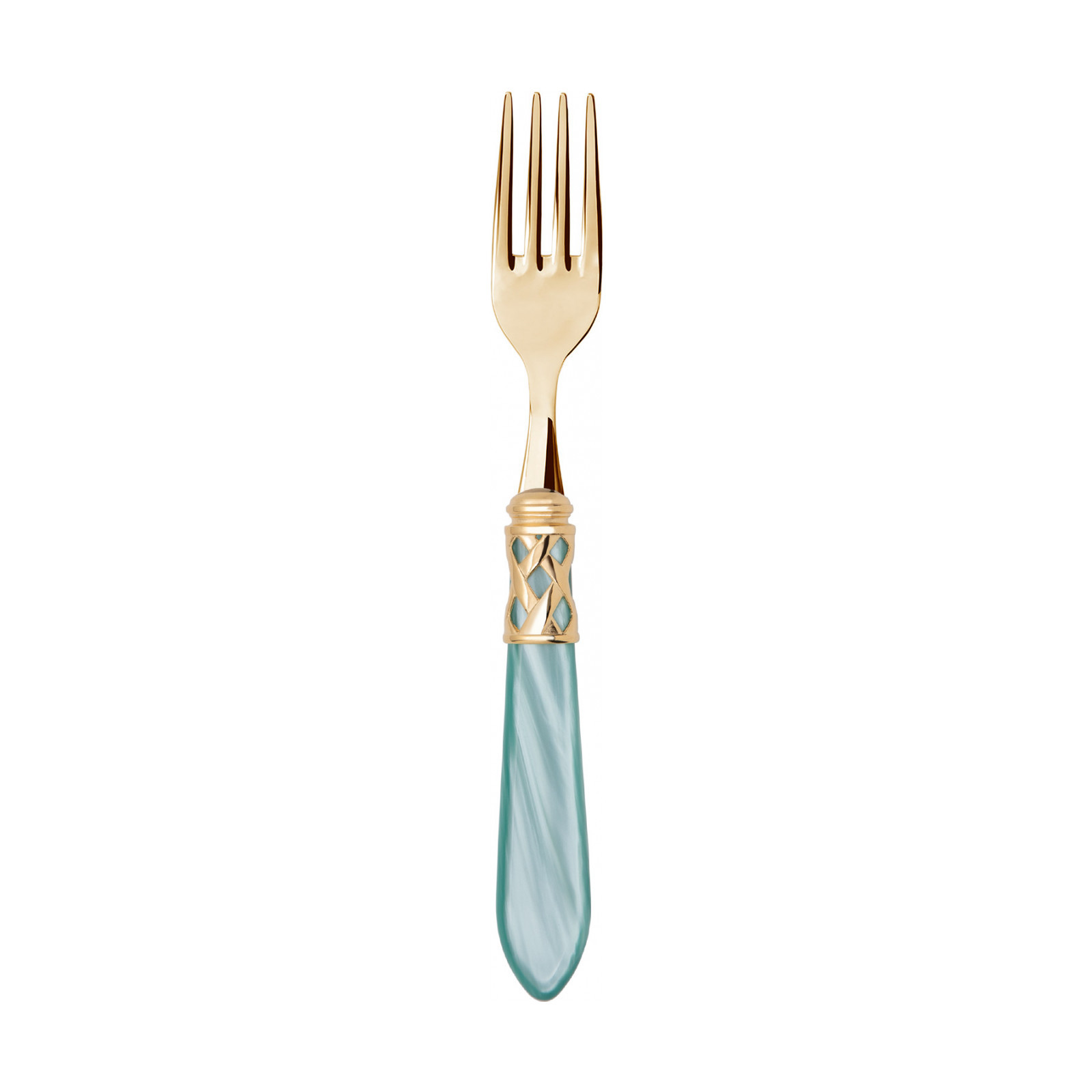 The coloured Aladdin Gold cutlery range was created to bring magic and performance to your table. Each individual piece is made with meticulous care; made of PVD Gold 18/10 stainless steel, the cutlery features an elegant acrylic handle combined with a refined braided ring with a golden finish.