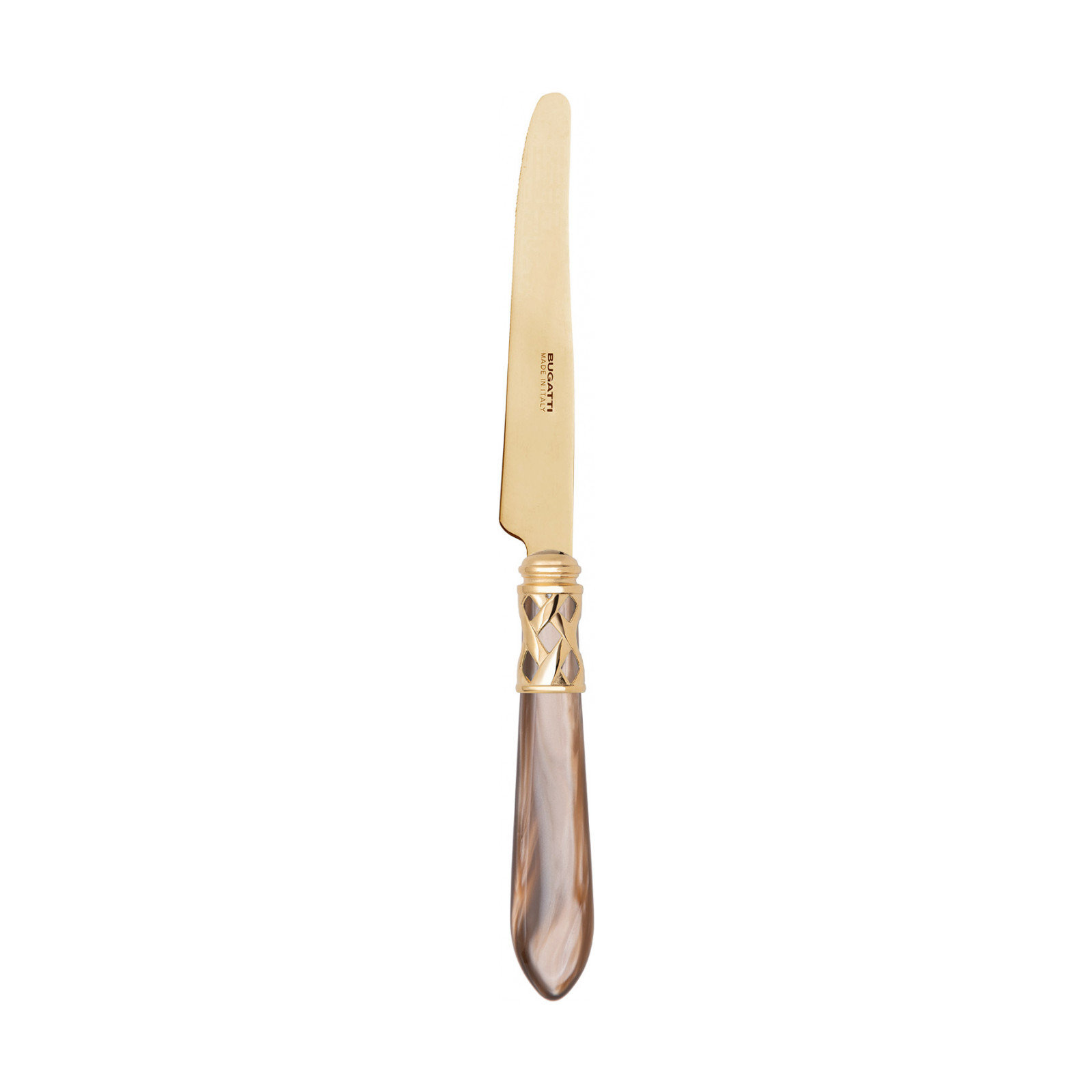 The coloured Aladdin Gold cutlery range was created to bring magic and performance to your table. Each individual piece is made with meticulous care; made of PVD Gold 18/10 stainless steel, the cutlery features an elegant acrylic handle combined with a refined braided ring with a golden finish.