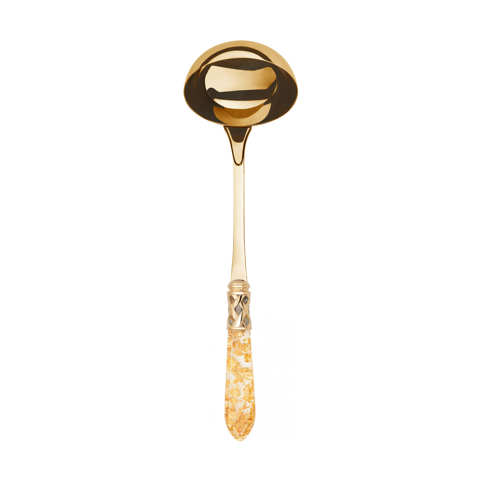 The coloured Aladdin Gold cutlery range was created to bring magic and performance to your table. Each individual piece is made with meticulous care; made of PVD Gold 18/10 stainless steel, the cutlery features an elegant acrylic handle combined with a refined braided ring with a golden finish.