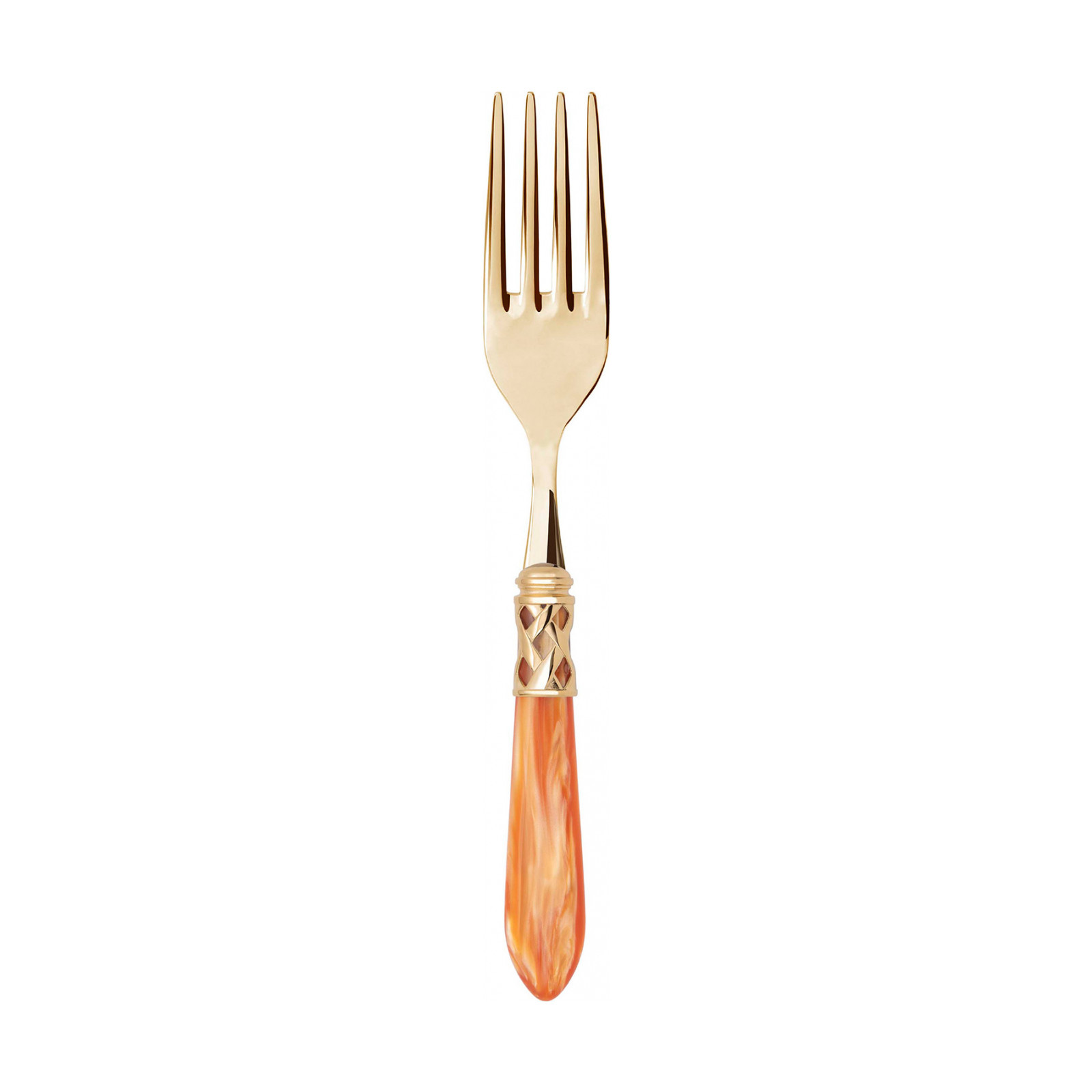 The coloured Aladdin Gold cutlery range was created to bring magic and performance to your table. Each individual piece is made with meticulous care; made of PVD Gold 18/10 stainless steel, the cutlery features an elegant acrylic handle combined with a refined braided ring with a golden finish.