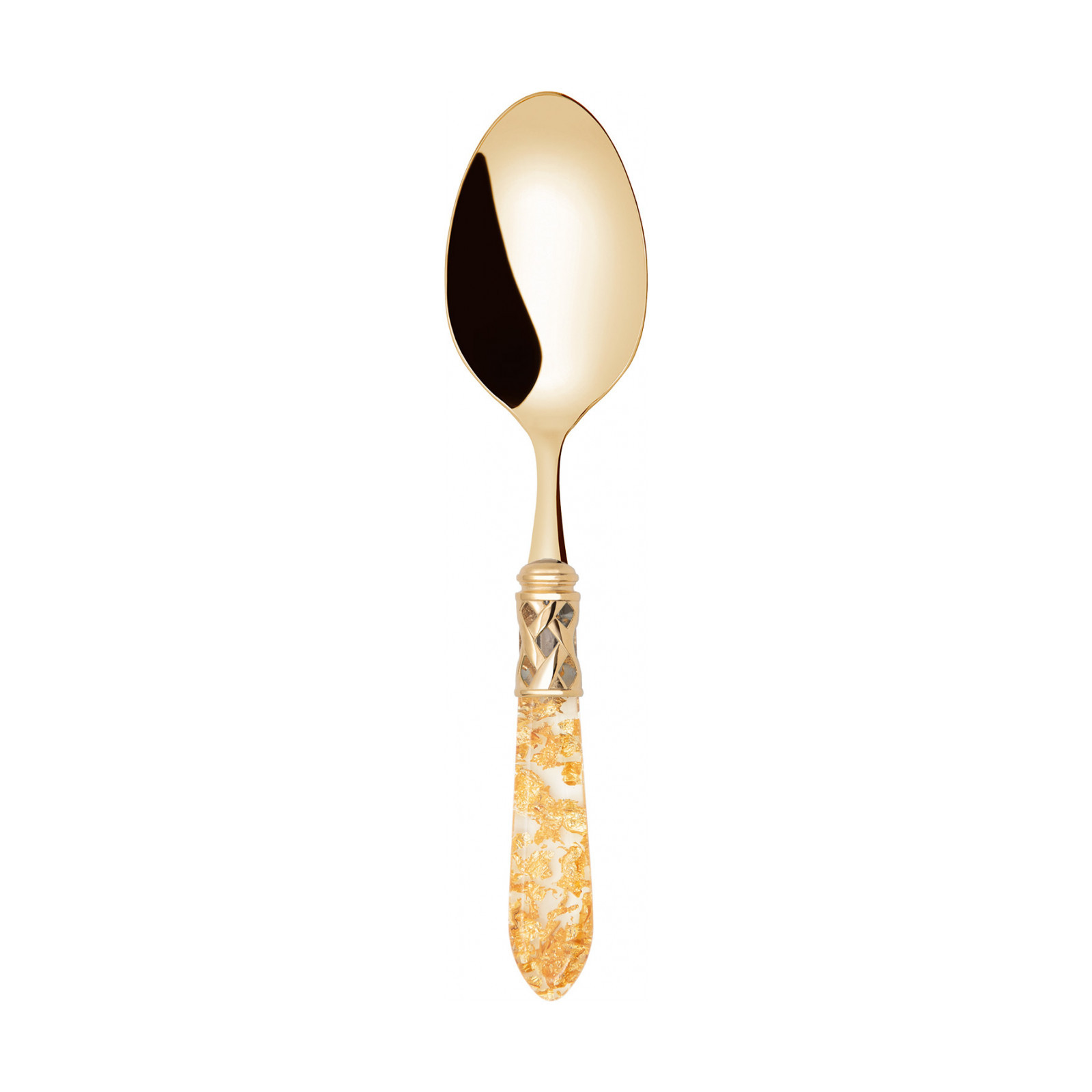 The coloured Aladdin Gold cutlery range was created to bring magic and performance to your table. Each individual piece is made with meticulous care; made of PVD Gold 18/10 stainless steel, the cutlery features an elegant acrylic handle combined with a refined braided ring with a golden finish.