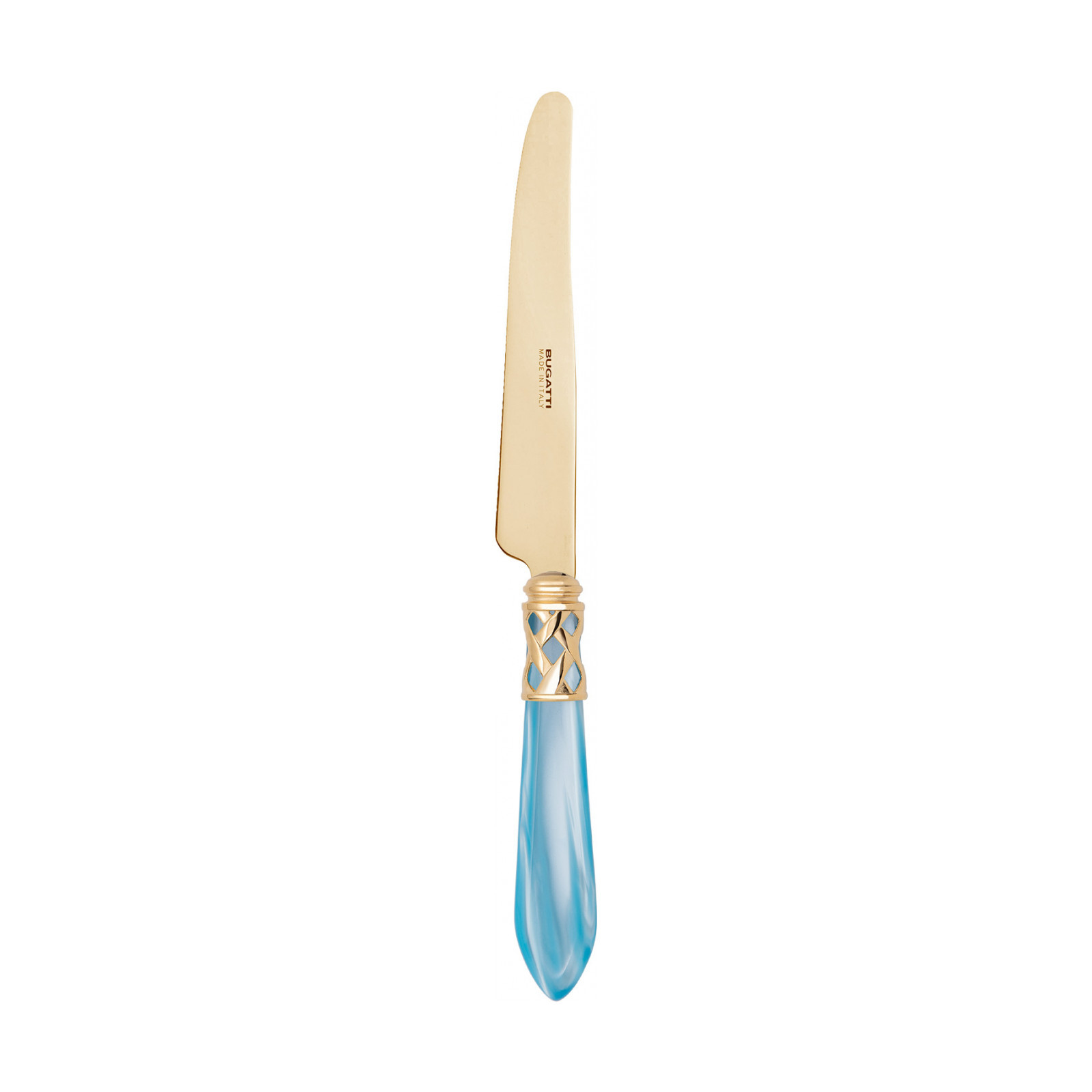 The coloured Aladdin Gold cutlery range was created to bring magic and performance to your table. Each individual piece is made with meticulous care; made of PVD Gold 18/10 stainless steel, the cutlery features an elegant acrylic handle combined with a refined braided ring with a golden finish.