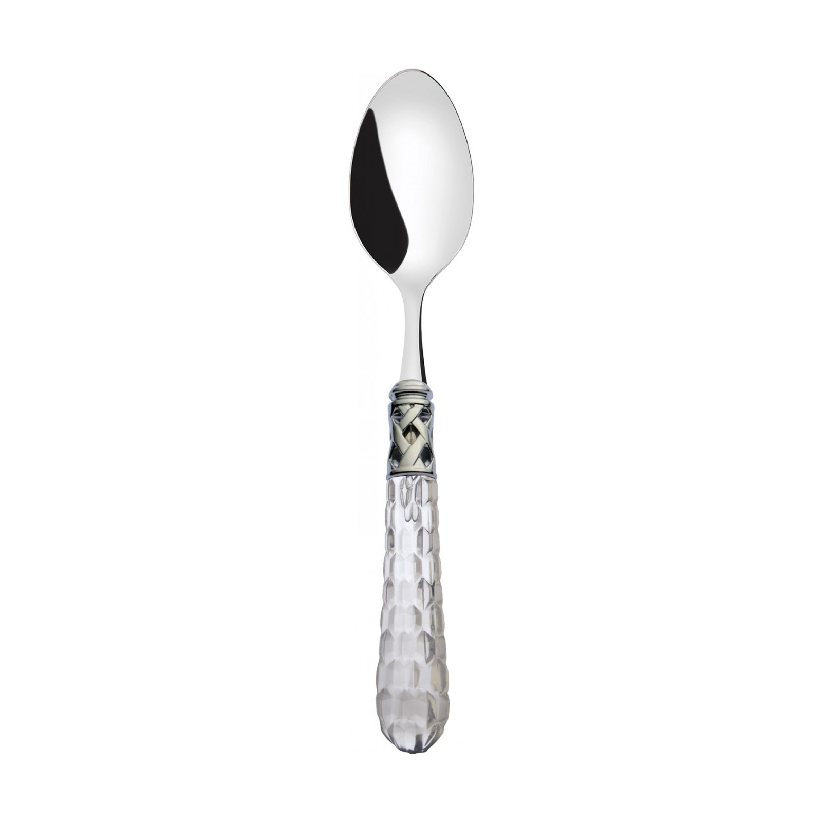 The Bohemia Shining Ring coloured cutlery set decorates your table in tasteful yet unconventional style. The design of this 18/10 stainless steel cutlery set is centred on a polished steel braided ring and a finely decorated translucent coloured handle shaped with multiple facets reminiscent of crystal surfaces. This cutlery is dishwasher safe.