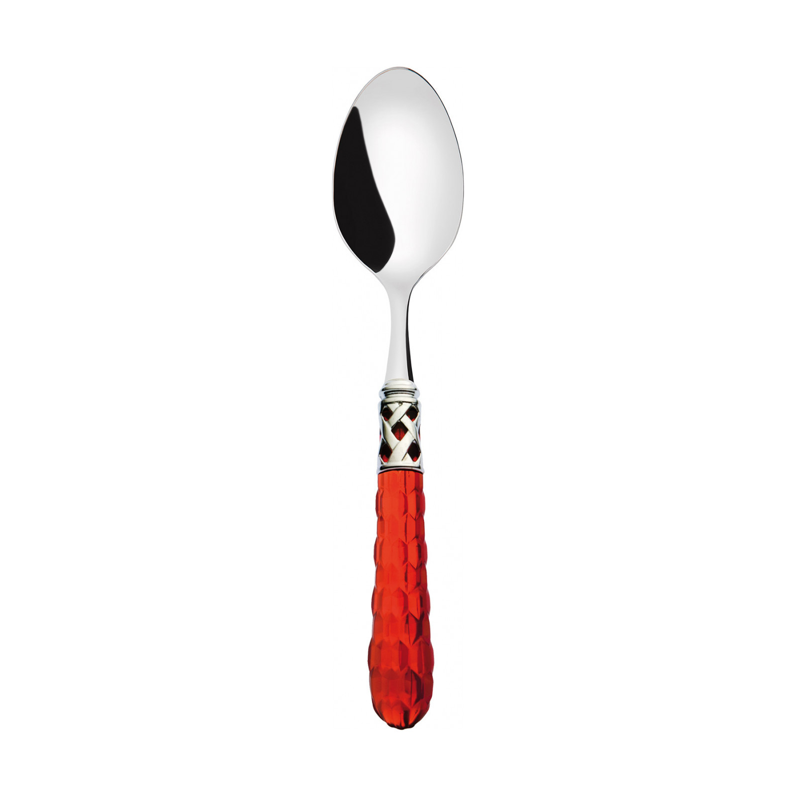 The Bohemia Shining Ring coloured cutlery set decorates your table in tasteful yet unconventional style. The design of this 18/10 stainless steel cutlery set is centred on a polished steel braided ring and a finely decorated translucent coloured handle shaped with multiple facets reminiscent of crystal surfaces. This cutlery is dishwasher safe.