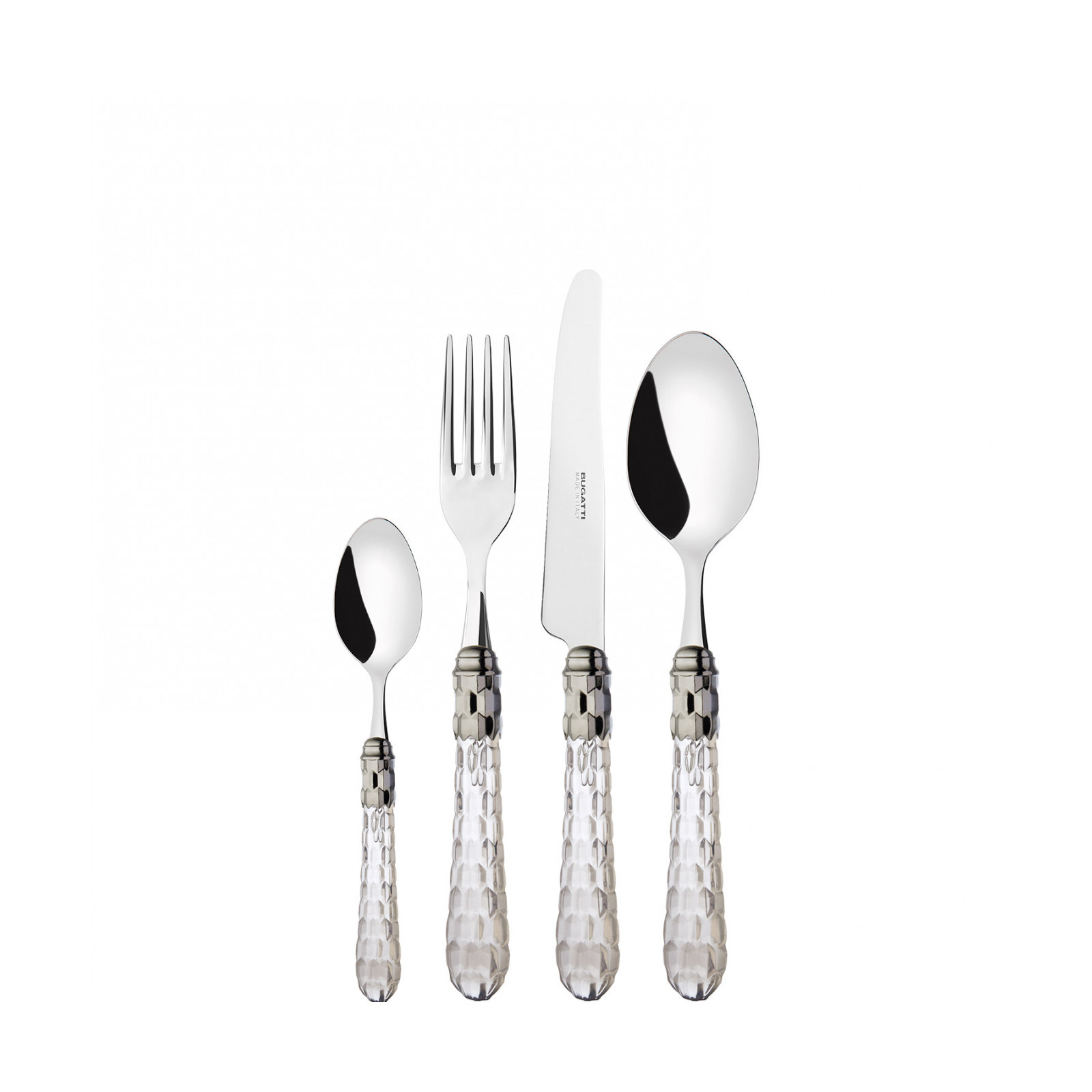 Cristallo Shining Ring coloured cutlery features a polished steel coloured ring and a transparent handle embellished with numerous crystal-like facets. The Cristallo cutlery set is the original choice for those who want to decorate their table with authentic tableware jewels. This cutlery range is made from 18/10 stainless steel and is dishwasher safe.