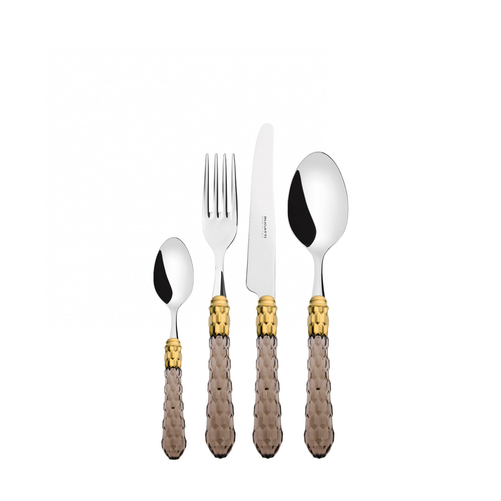 Cristallo Gold-Plated Ring coloured cutlery features a gold-plated ring and a transparent handle embellished with numerous crystal-like facets. The Cristallo cutlery set is the original choice for those who want to decorate their table with authentic tableware jewels. This cutlery range is made of 18/10 stainless steel.