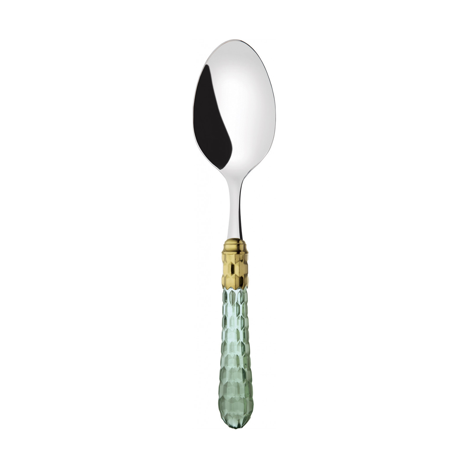 Cristallo Gold-Plated Ring coloured cutlery features a gold-plated ring and a transparent handle embellished with numerous crystal-like facets. The Cristallo cutlery set is the original choice for those who want to decorate their table with authentic tableware jewels. This cutlery range is made of 18/10 stainless steel.
