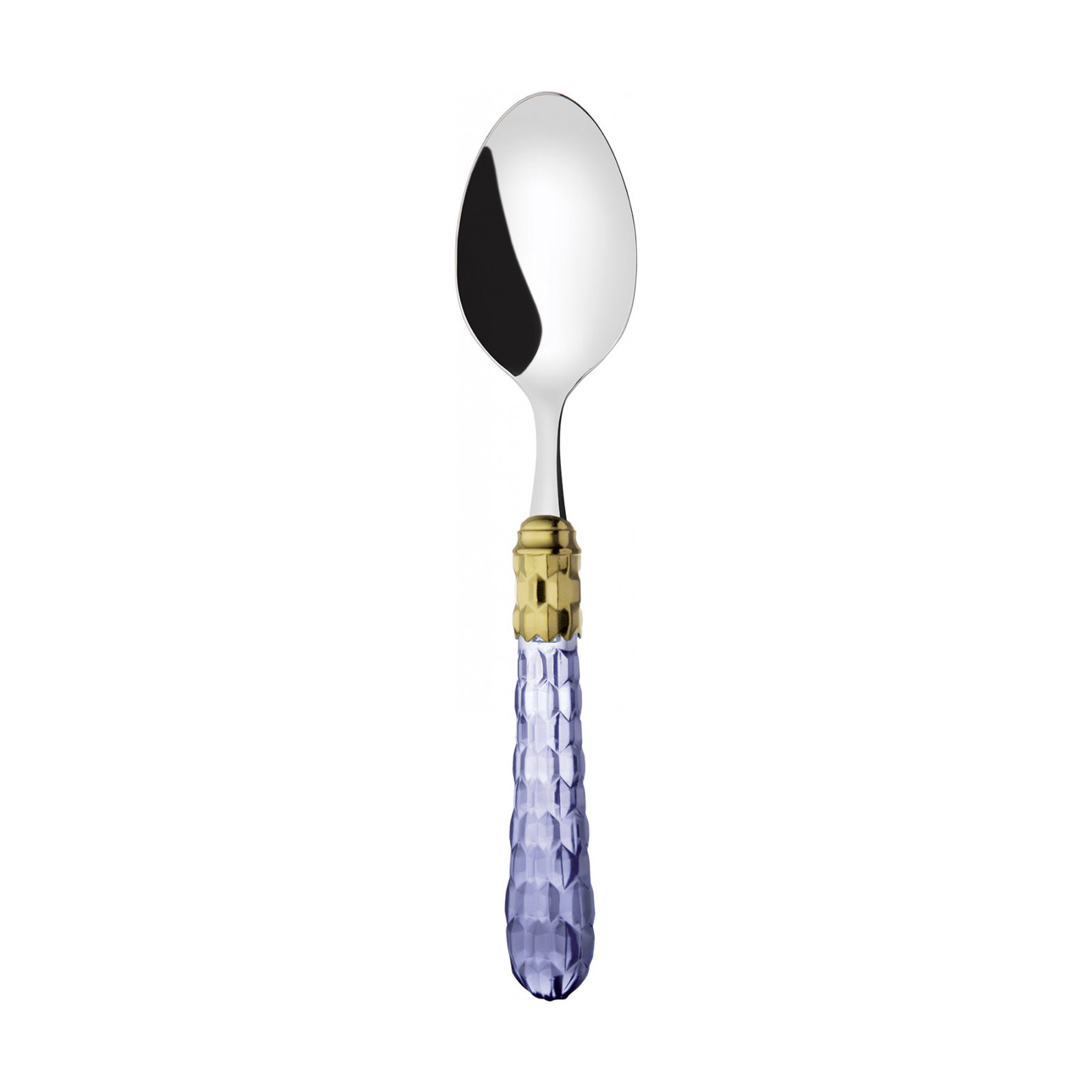 Cristallo Gold-Plated Ring coloured cutlery features a gold-plated ring and a transparent handle embellished with numerous crystal-like facets. The Cristallo cutlery set is the original choice for those who want to decorate their table with authentic tableware jewels. This cutlery range is made of 18/10 stainless steel.