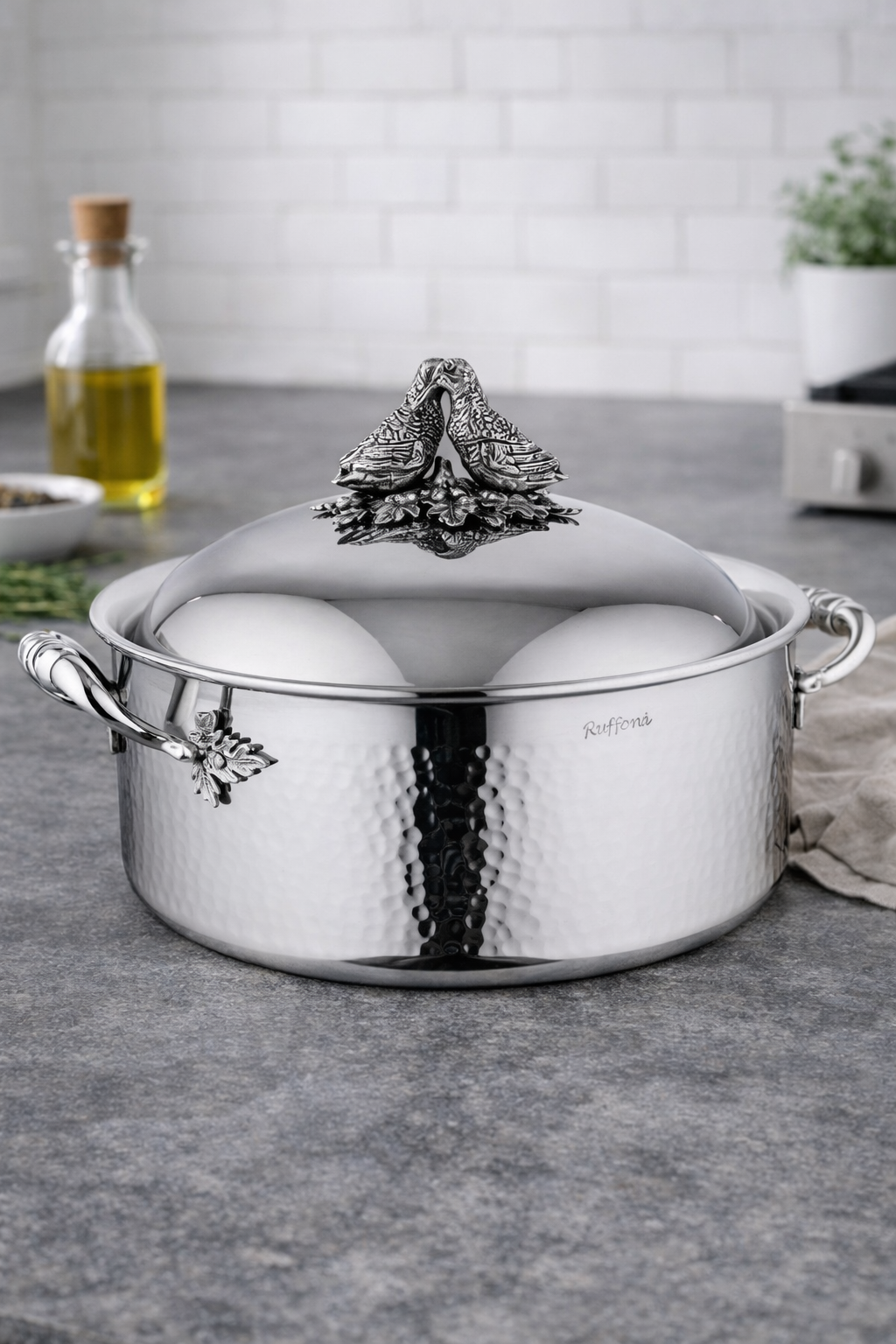 A charming soup pot from the Lovebirds Edition collection. Handmade in Italy, featuring a domed lid adorned with a pair of lovebirds. Copper exterior with stainless steel interior, Ø 20cm, 4 liters capacity.