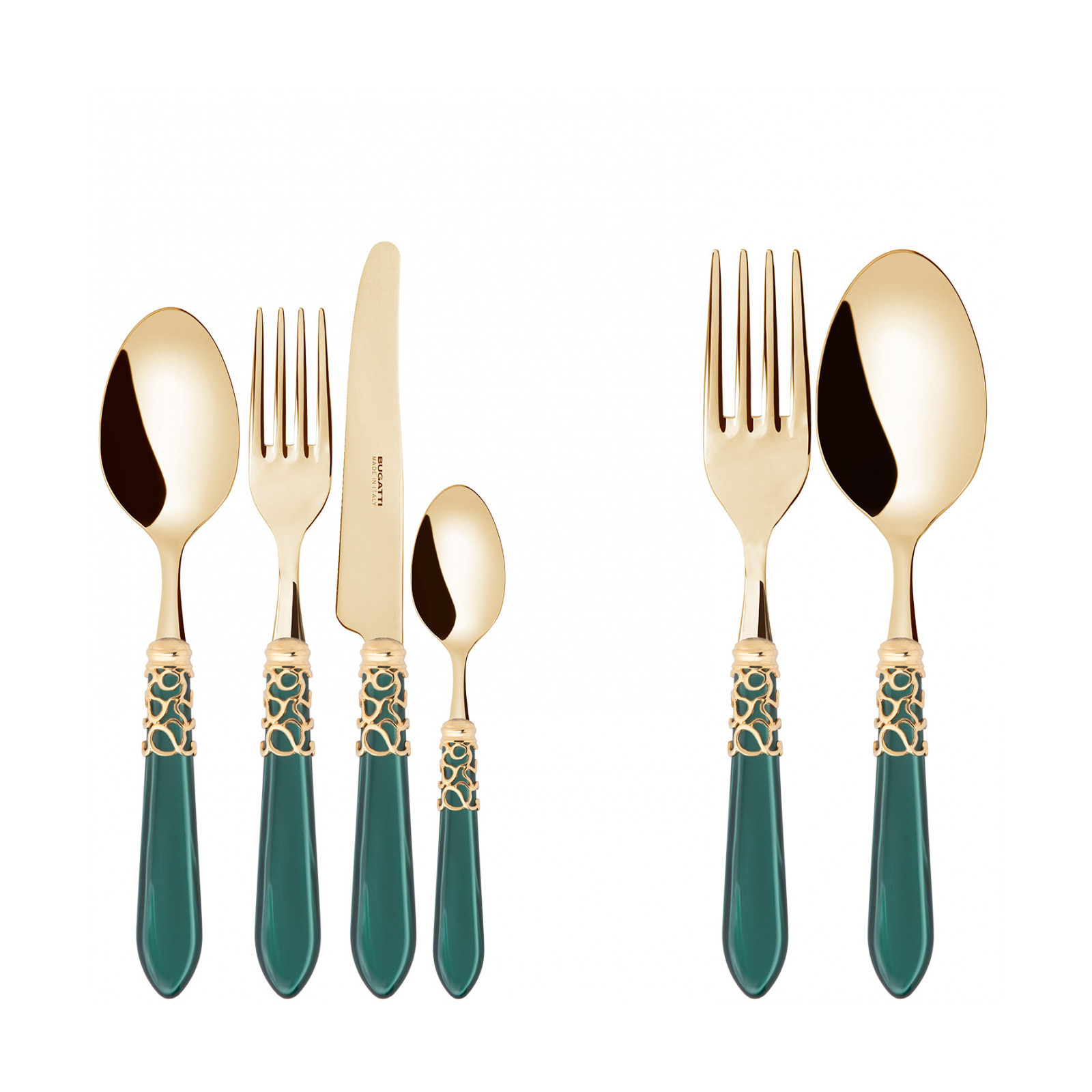 Choose the Melody Gold coloured cutlery set to enchant and captivate your guests at the table. Each piece is crafted with meticulous care and attention in gold PVD-coated 18/10 stainless steel. The elegant acrylic handle and a precious ring with a gold finish recalls the intertwined melodic notes of a memorable musical performance.