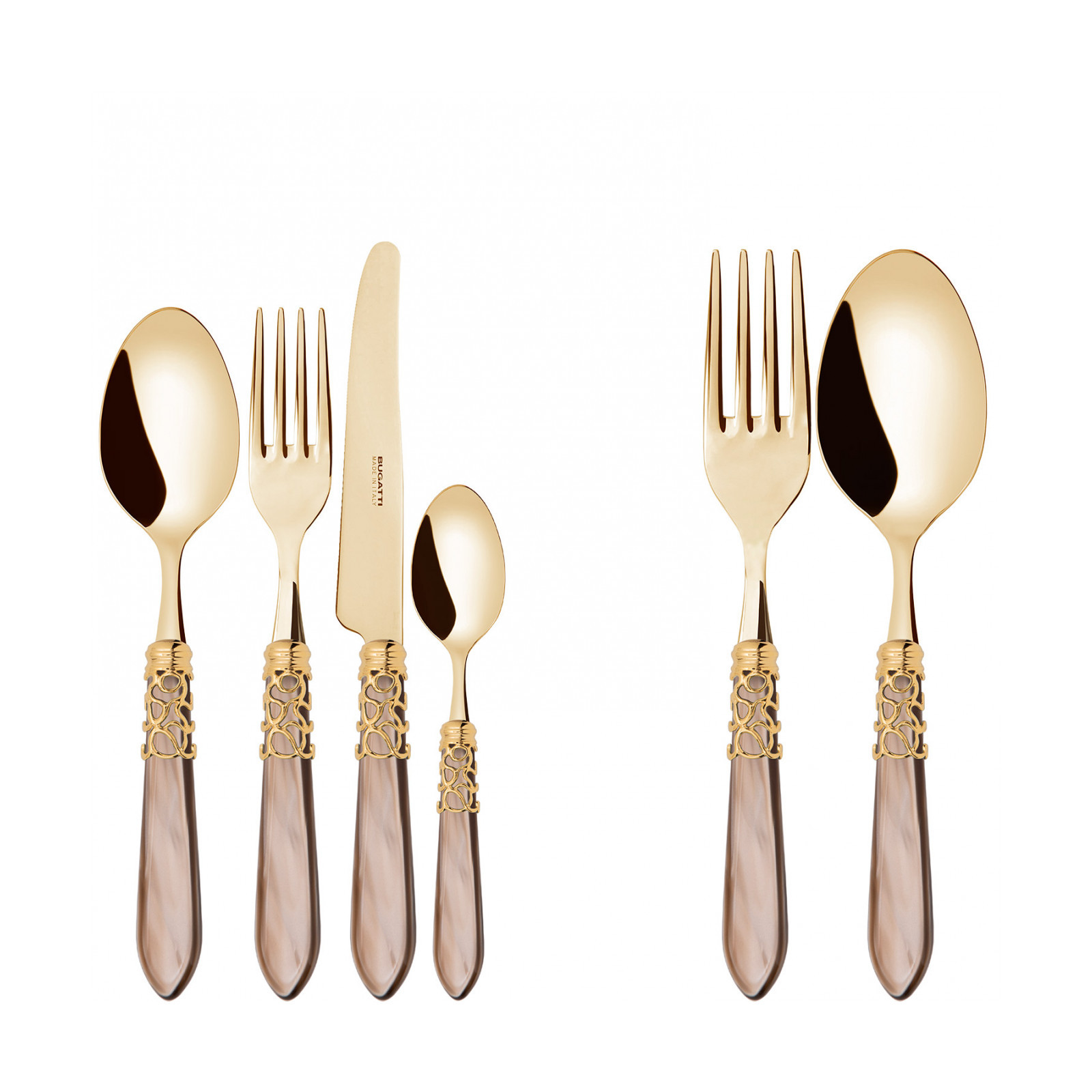 Choose the Melody Gold coloured cutlery set to enchant and captivate your guests at the table. Each piece is crafted with meticulous care and attention in gold PVD-coated 18/10 stainless steel. The elegant acrylic handle and a precious ring with a gold finish recalls the intertwined melodic notes of a memorable musical performance.