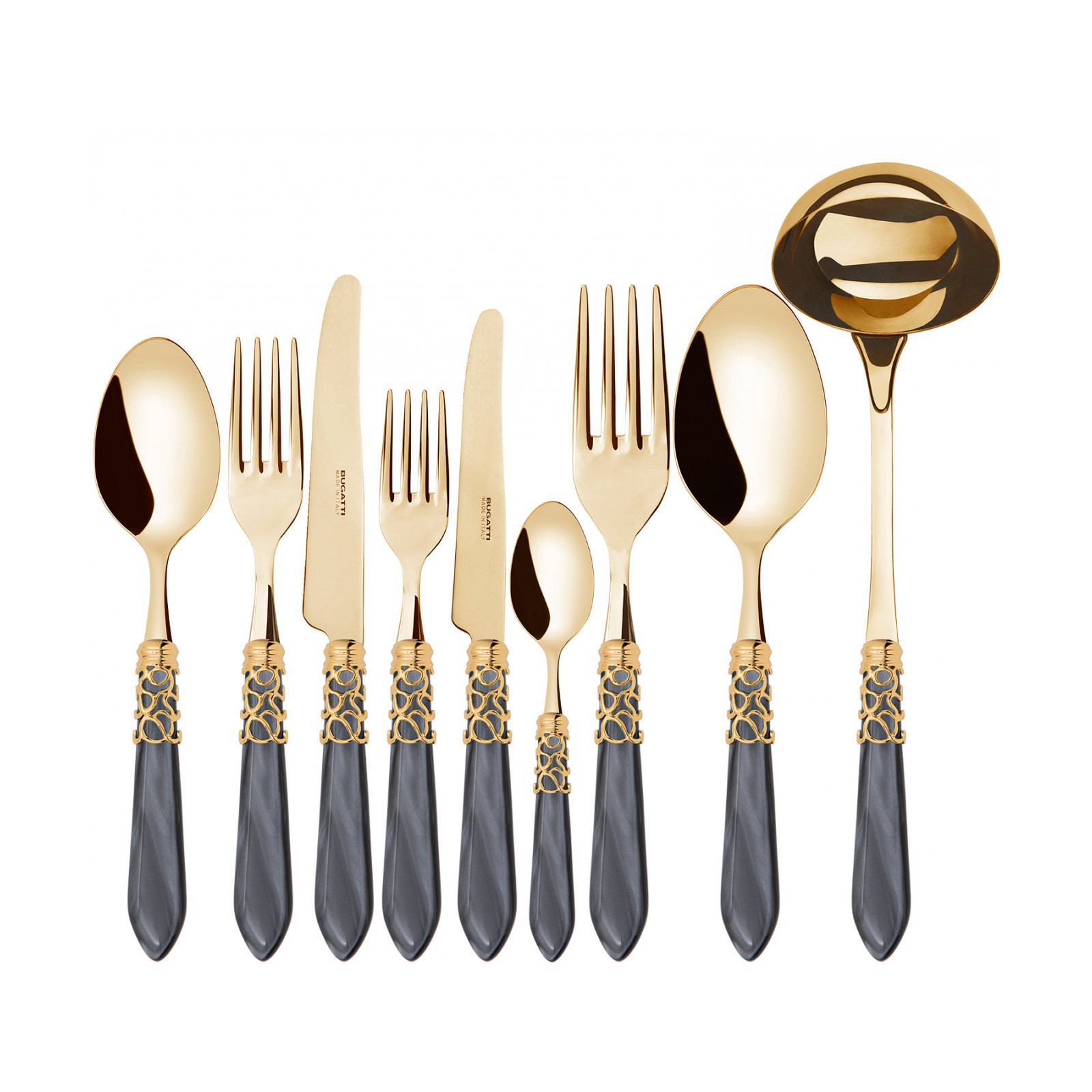 Choose the Melody Gold coloured cutlery set to enchant and captivate your guests at the table. Each piece is crafted with meticulous care and attention in gold PVD-coated 18/10 stainless steel. The elegant acrylic handle and a precious ring with a gold finish recalls the intertwined melodic notes of a memorable musical performance.